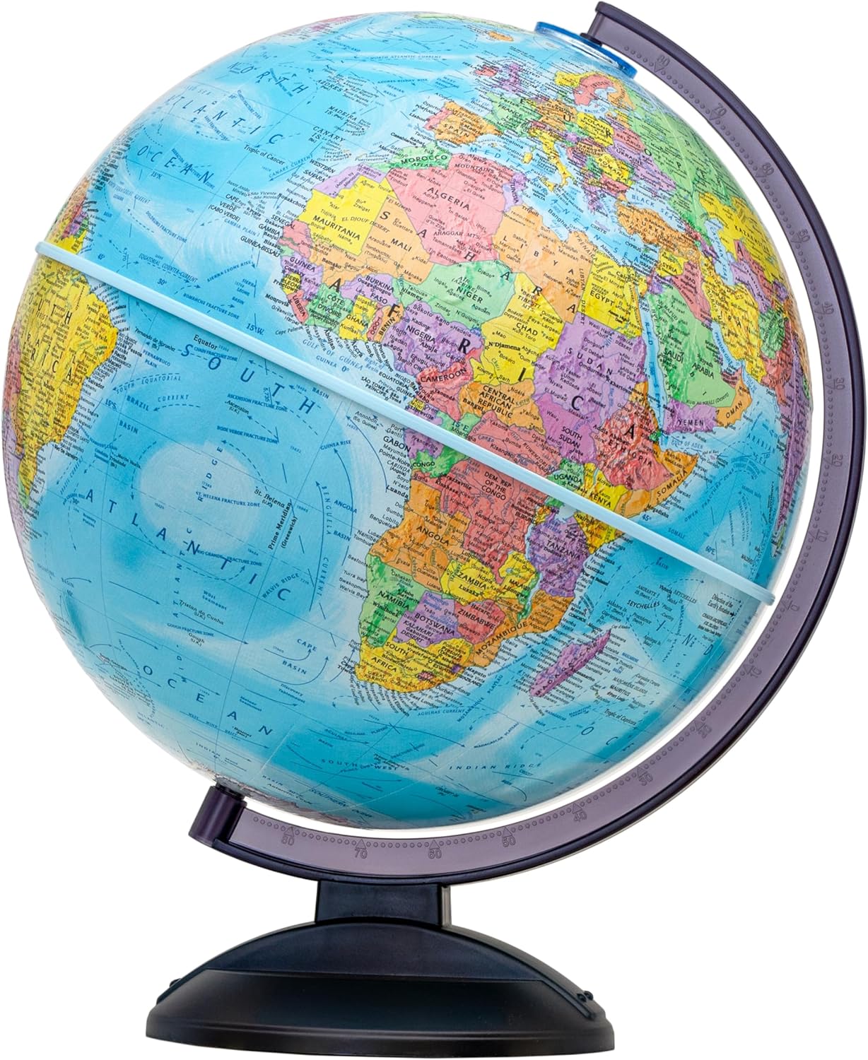 Replogle Easy to Assembel 12" Diameter Globe, USA Cartography with Raised Mountain Relief and Sturdy Base. Lightweight and durable, this 12” antique ocean globe is a great tool for students. The smoke black molded base and semi-meridian are scratch resistant and strong. The globe is very easy to assemble and comes with detaled instructions. In minutes you will have this globe assembled and ready for use.