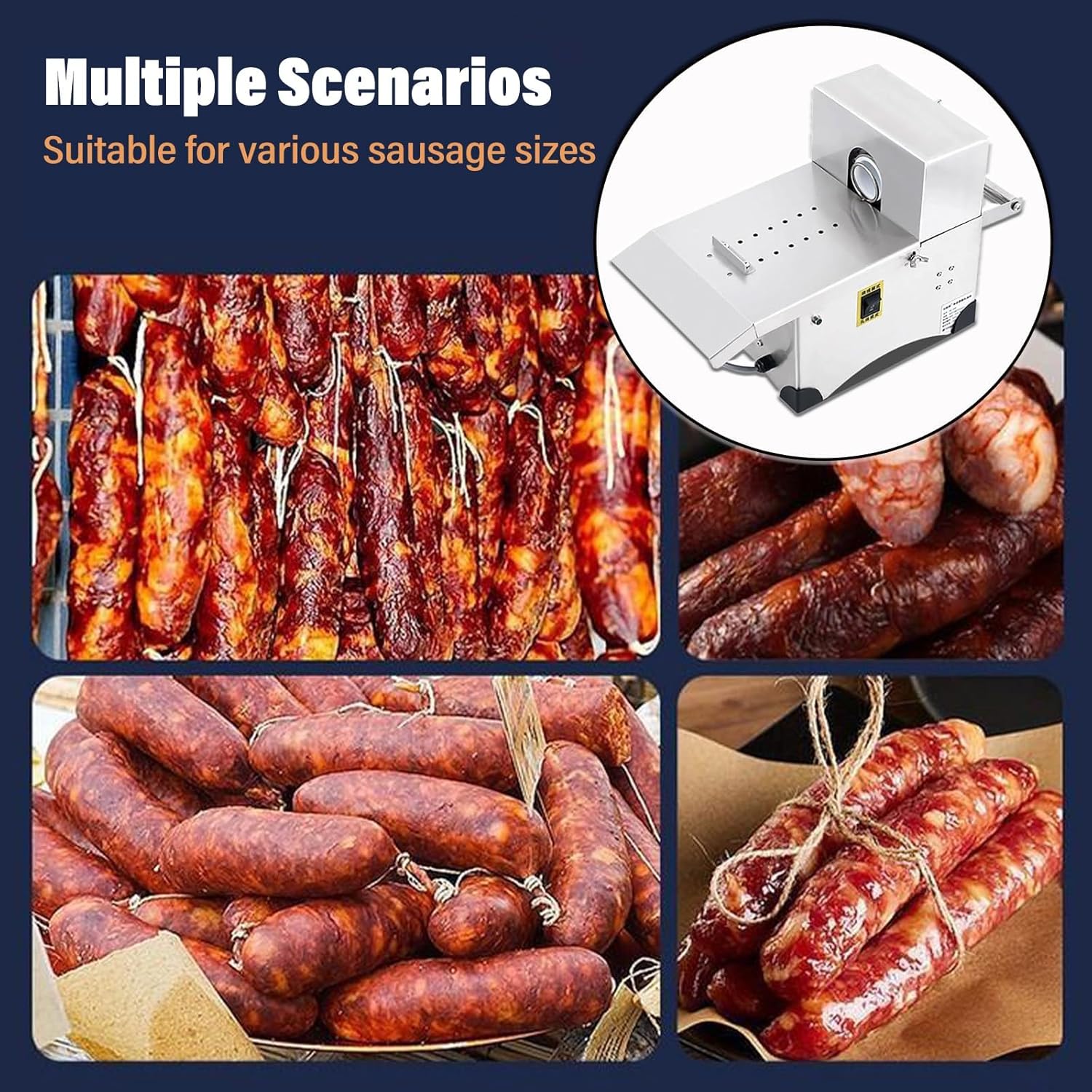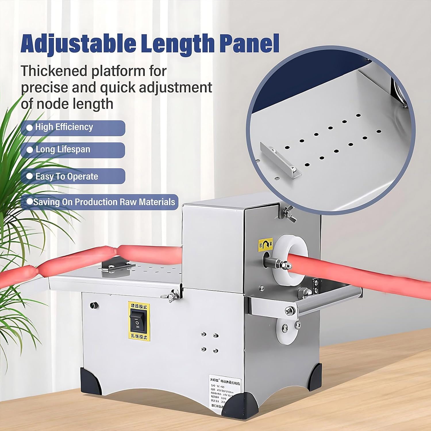 This sausage tying machine simplifies the sausage production process for both commercial and home users. It produces sausages of uniform size with minimal manual operation. Equipped with automatic tying and packaging functions, the machine can precisely tie and package the sausages.➤➤ Key Features and Advantages● High-efficiency automated operation● The winding mode allows for quick spool changes, facilitating rapid rope replacement by operators.● Suitable for various sausage sizes.● Foot pedal operation frees both hands for faster, easier, and more efficient sausage tying.● Constructed from food-grade 304 stainless steel.● Designed specifically for butcher shops, restaurants, food processing plants, and home sausage making.● Features high-speed bundling, material savings, and ease of use.➤➤ Specification: Name: Automatic sausage making machineLeistung: 200 WVoltage: 110V/230VMaterial: Edelstahl 304 (lebensmittelecht)Suitable sausage diameter: 0-50mmProduct Dimensions: 45 × 21 × 26 cmProduct Weight:10kg➤➤Package Contents:1 * Sausage knotting machine1 * pedal4 * twine➤➤ 24-Hour Customer Service:If you have any questions, please feel free to contact us. We are dedicated to serving you and will respond to your inquiries within 24 hours.