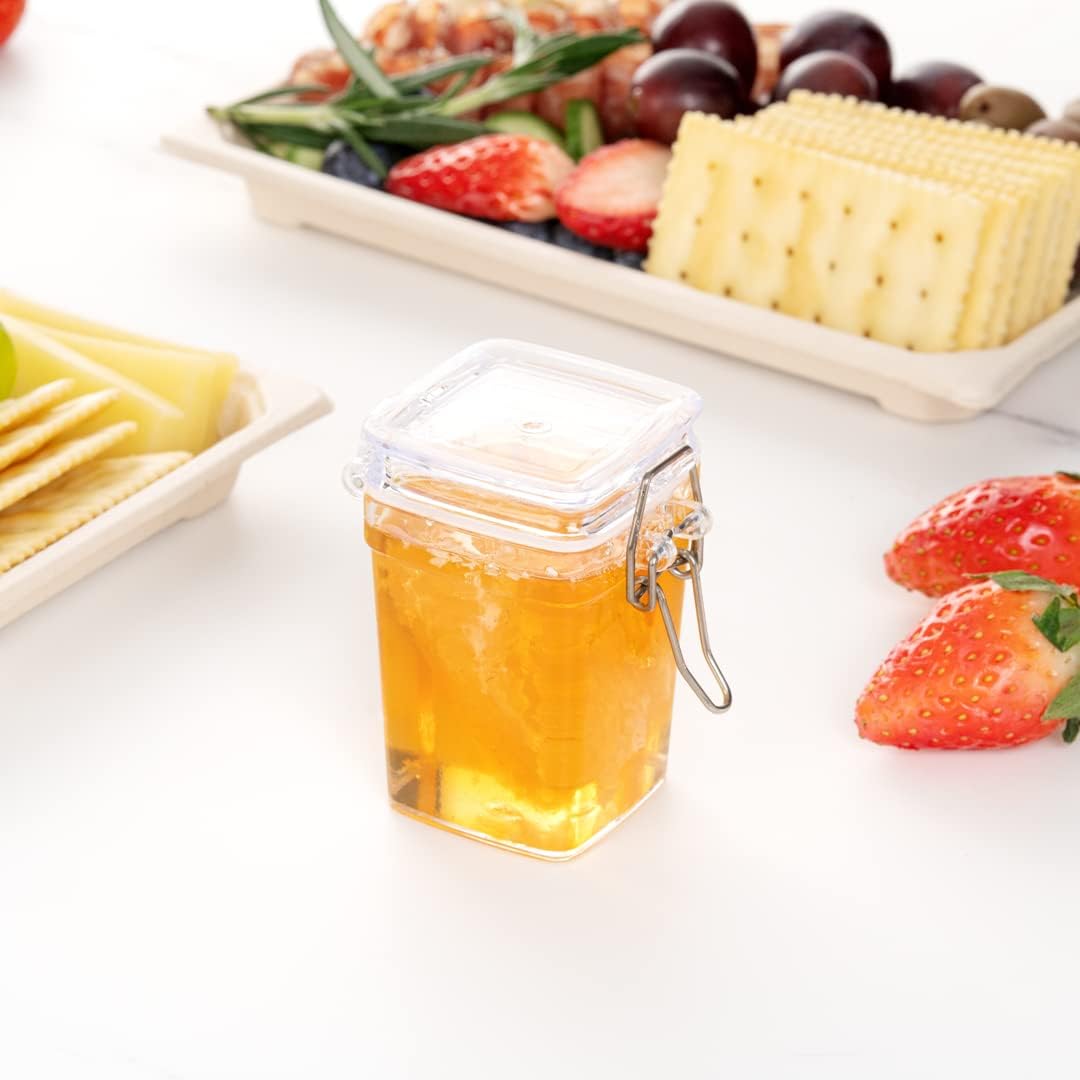 Add style to snack presentations using our 3-ounce Square Clear Plastic Nostalgic Mason Jars. Made to look like authentic glass mason jars, these plastic mason jars are constructed with premium plastic and can be reprocessed to meet the eco-friendly standards of your restaurant. To keep condiments, sweets, and jams fresh, these clear mason jars are equipped with a metal clamp lid that securely latches onto jars to create an airtight seal. The crystal clear finish of these 3-ounce mason jars provides customers with full visibility of their snacks. With a square design, these plastic mason jars can contain up to 3 ounces of food. These clear mason jars have a flat base that provides stability on surfaces to prevent accidents. These mason jars measure 2.5 inches in length by 1.8 inches in width by 2.9 inches in height. Sold in a 100 count box.