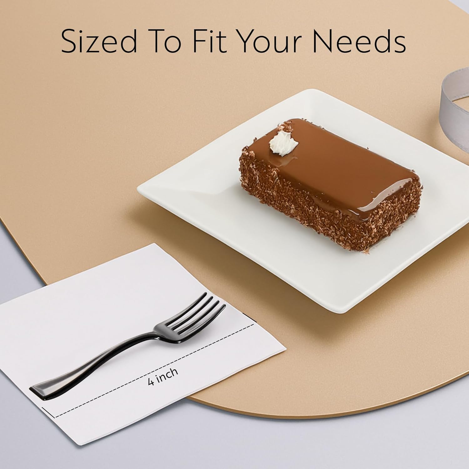 Provide an elegant and upscale flatware solution with our Black Plastic Mini Forks. With their miniature construction, these small plastic forks are perfectly suited for serving alongside slices of wedding cake, miniature deconstructed desserts, or tasting courses. Made from high-quality plastic, these small disposable forks are reliably sturdy and designed to stay strong under pressure. This plastic cutlery is great for serving dry desserts and wet foods like meatballs or salads without getting flimsy. After use, simply discard these disposable forks, avoiding the need for washing and drying. These mini forks measure 4 inches in length. Sold in a 500 count box.