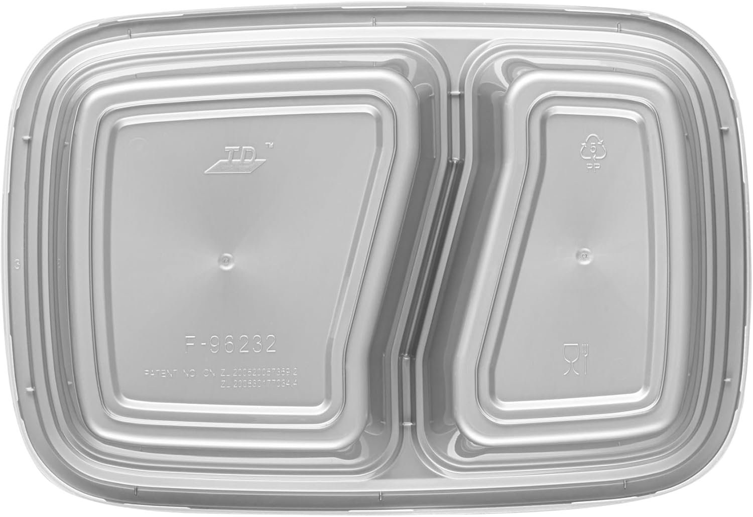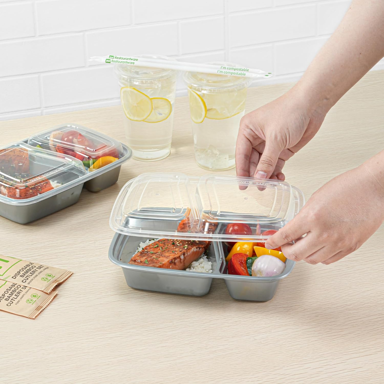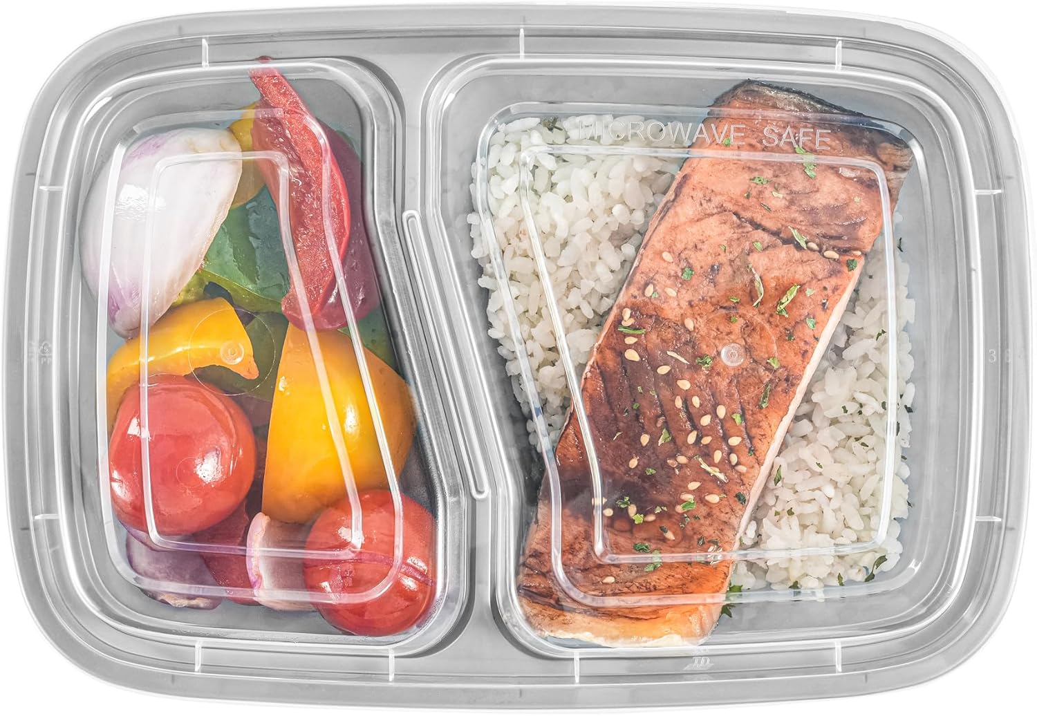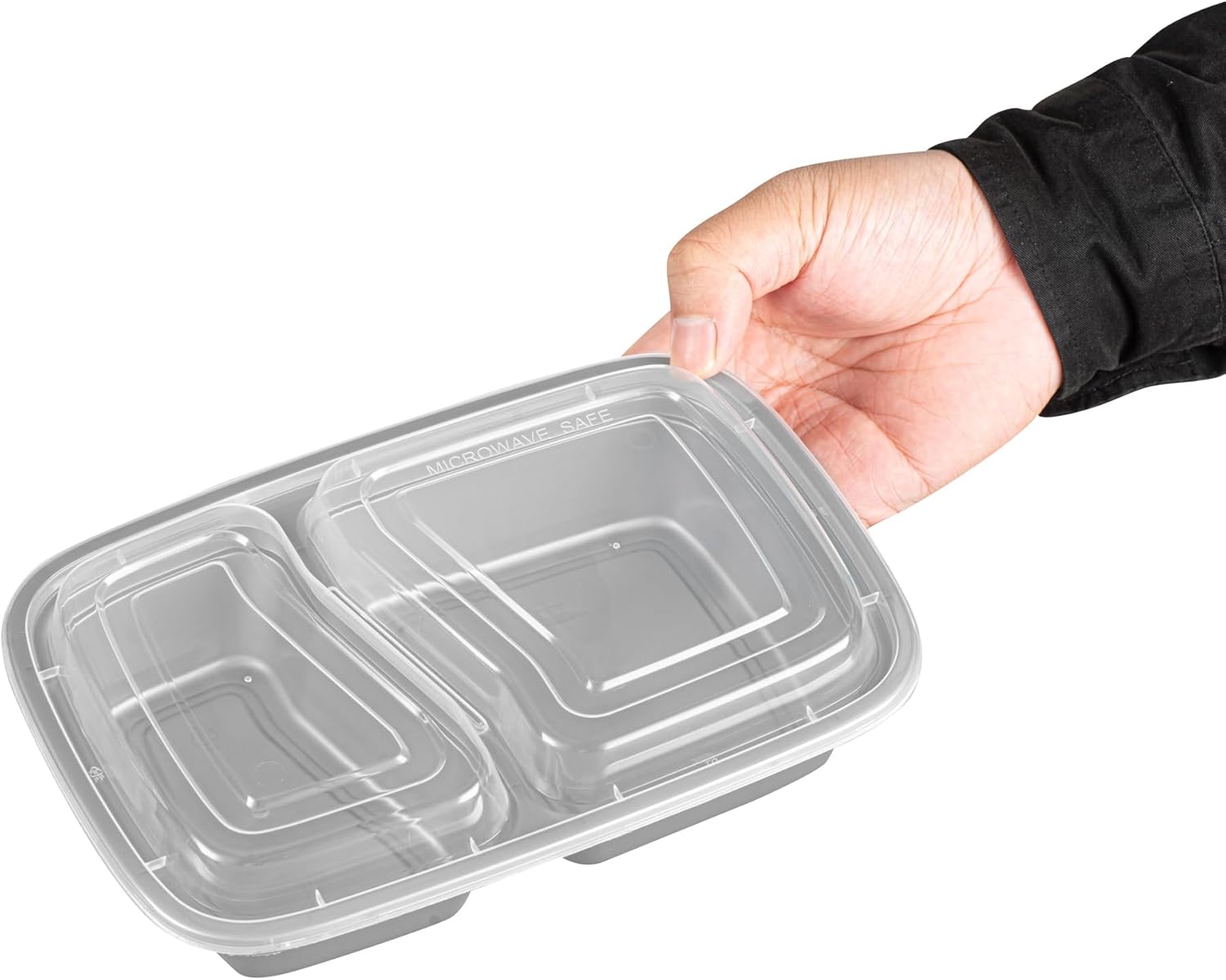 Pack your culinary creations with our Asporto 32-ounce Silver Plastic 2 Compartment Food Containers. These meal prep containers have 2 compartments that have a capacity of 12.5 and 8 ounces and efficiently separate entrees from snacks or sides. The clear plastic lids of these carry out containers snap on tightly, minimizing the risk of spills and avoiding messes. These takeaway boxes are microwavable and allow you to reheat meals without transferring them to different containers. Made from plastic that does not contain BPA, these take out containers are durable, making them perfect for packing various hot and cold food items. The sleek silver finish of these to go boxes enhances the presentation of your take out and delivery food orders. These to go containers are disposable and facilitate an easy cleaning experience. Measuring 8.7 inches in length by 6 inches in width by 2 inches in height, these disposable take out containers have a total capacity of 32 ounces. Sold in a 100 count box.