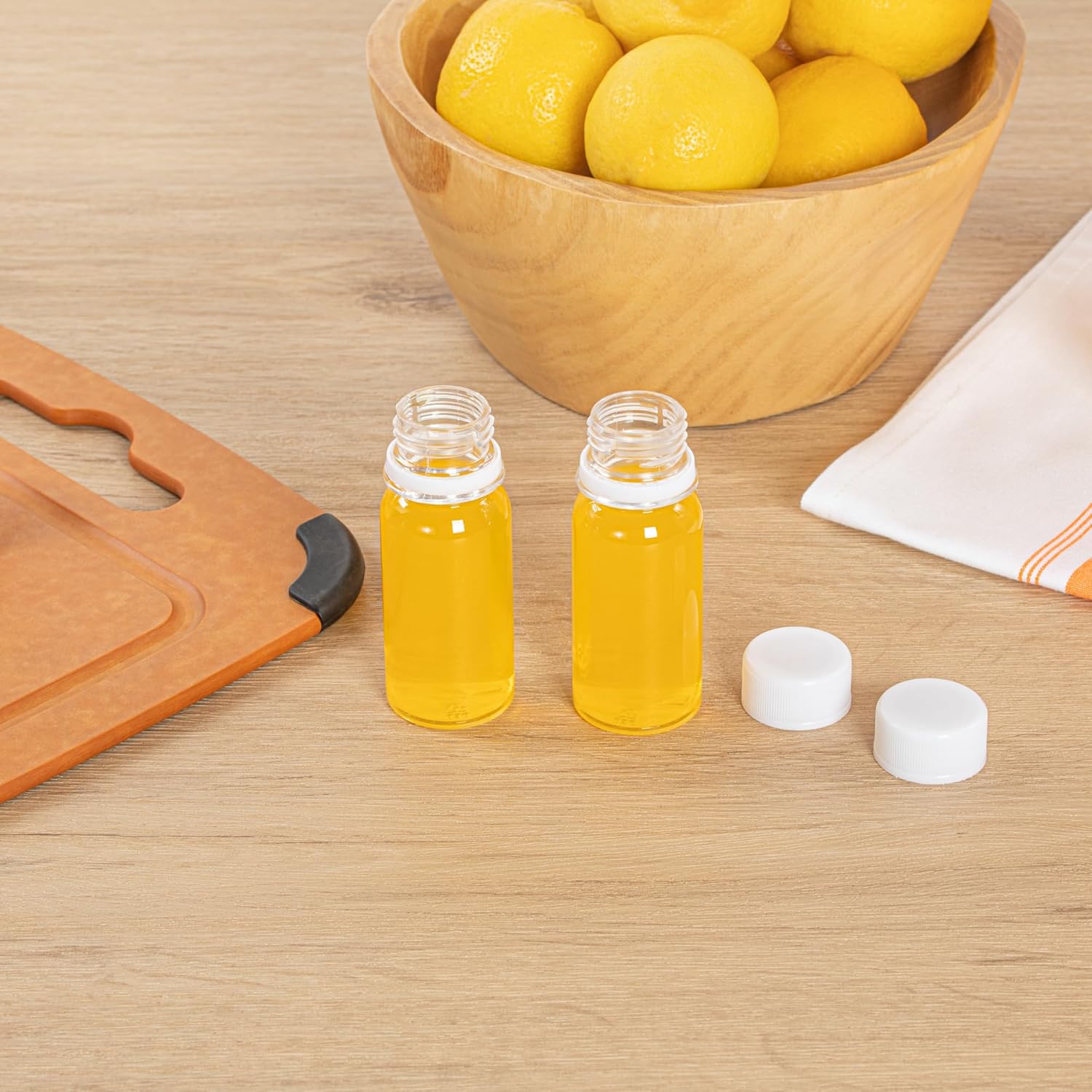 Restaurantware Bottle Tek 2 Ounce Mini Shot Bottles, 100 Disposable Clear Plastic Round Bottles with Caps, For Energy Drinks, Juices, Essential Oils, Outdoor Activities, Home Use