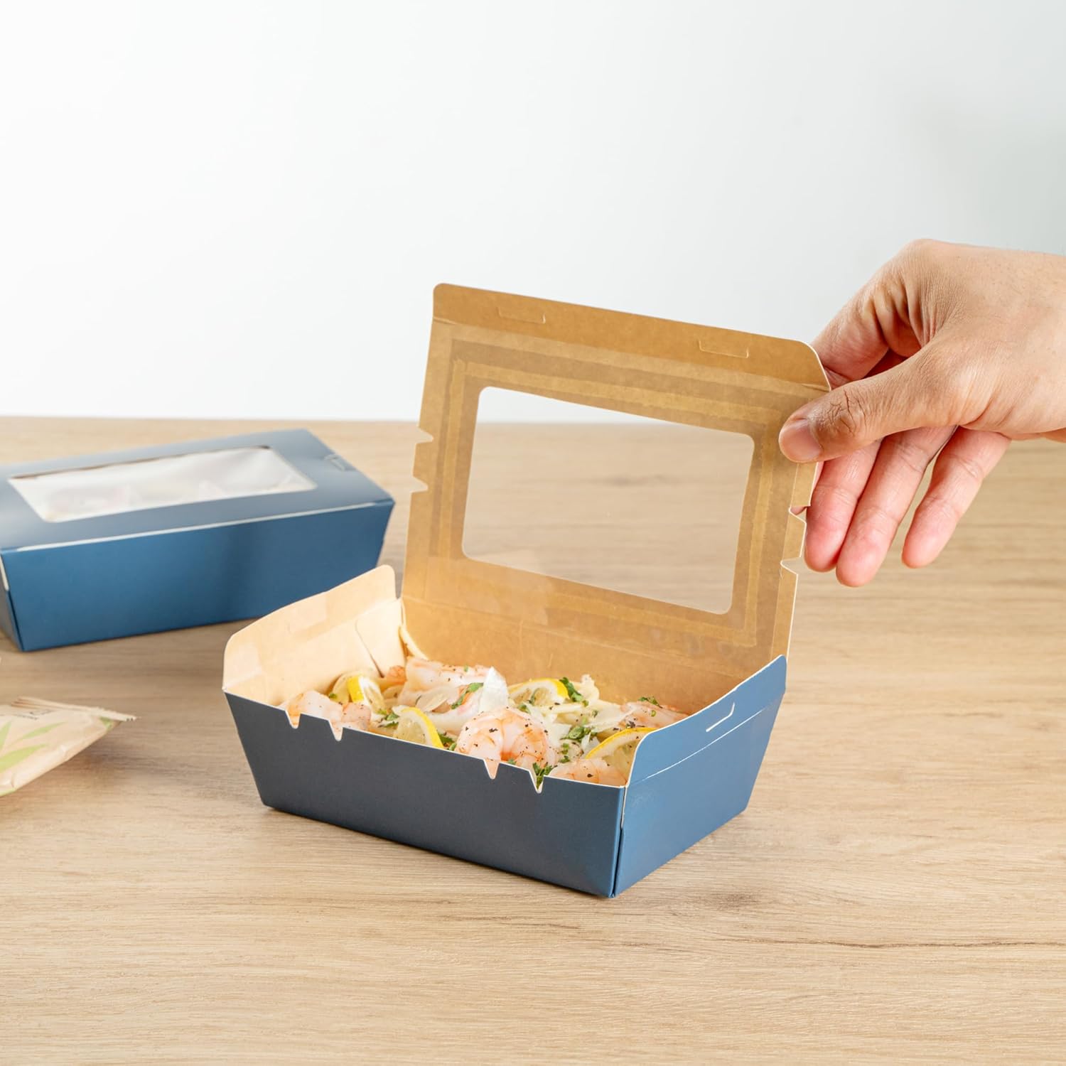 Carry out tasty side dishes and scrumptious desserts in our Cafe Vision 21-ounce Midnight Blue Paper Small Take Out Containers. Constructed from premium paper with a grease-impervious lining, these durable 21-ounce take out food containers offer a convenient solution for securely transporting treats without worrying about leaks and spills. Plus, they're reprocessable! Featuring a total of 4 built-in tab locks on either side and front, these versatile blue to go boxes firmly lock in delicious dishes, providing quick and secure packaging for take out and delivery services from your cafe, bakery, and restaurant. With a clear plastic window and sleek midnight blue finish, these sustainable carry out boxes allow customers to easily take a look at your restaurant's tasty side pasta salad or your bakery's sweet chocolate croissant in style. These small food containers measure 6.2 inches long by 4.1 inches wide and 1.8 inches tall. Sold in a 200 count box.
