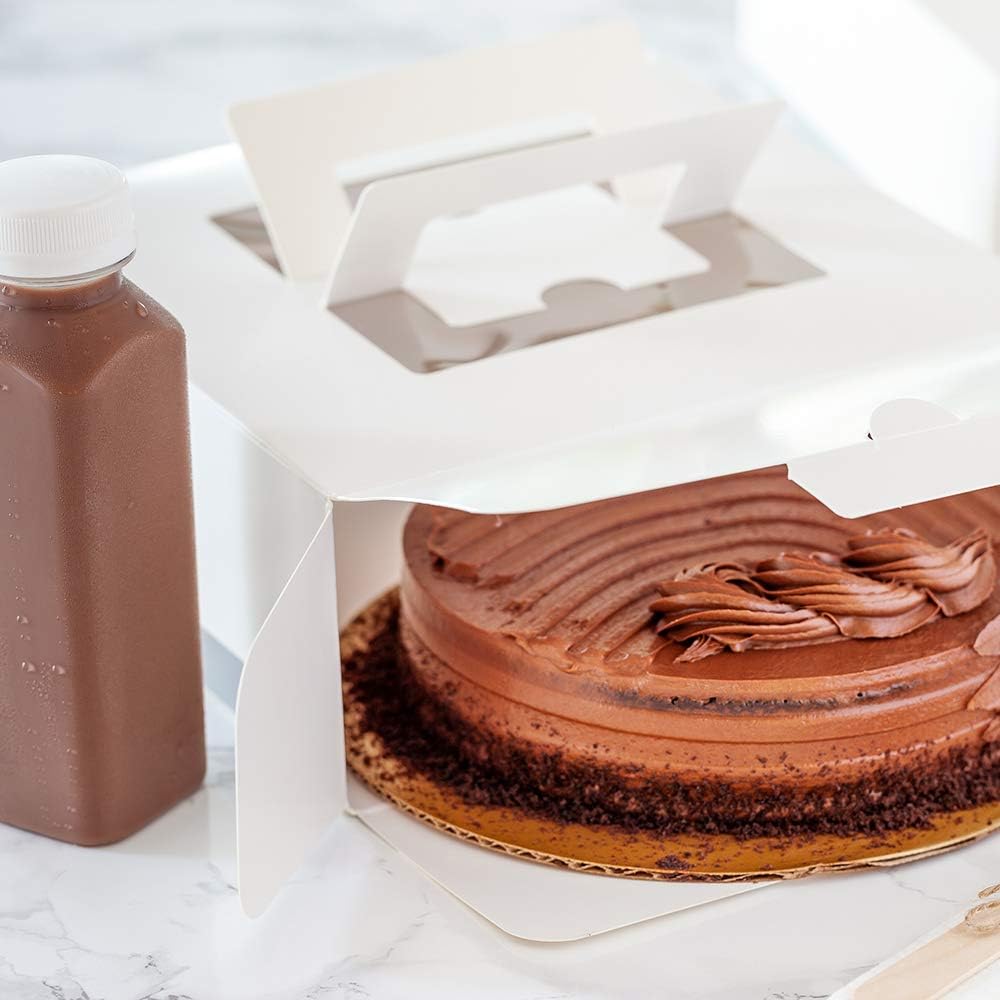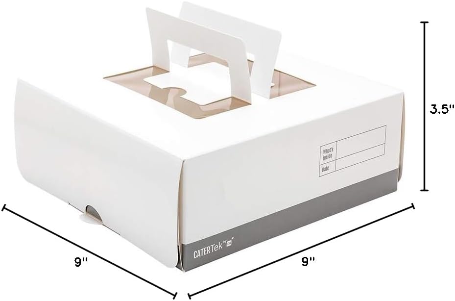 Conveniently package desserts using our Square White and Gray Paper Cake / Take Out Containers. These disposable lunch boxes feature pop-up handles to transport delivery orders with ease. When the handles of these paper cake boxes are popped up, a viewing window is revealed to provide you with a simple way to identify meals and prevent order mix-ups. With a grease-resistant coating, these durable cake boxes create a barrier for sticky fruit fillings or buttery frostings to eliminate messy accidents. These bakery boxes are made from heavyweight paper that sustains the weight of hefty cakes or pies without bending or breaking. Witha white and gray finish, these lunch boxes bring a unique and charming look to carry out orders. These paper containers with handles are recyclable for an eco-friendly way to dispose of containers after enjoying meals. Measuring 9 inches long by 9 inches wide and 3.5 inches tall, these lunch boxes with handles are shipped flat. Shipped in a 50 count box.