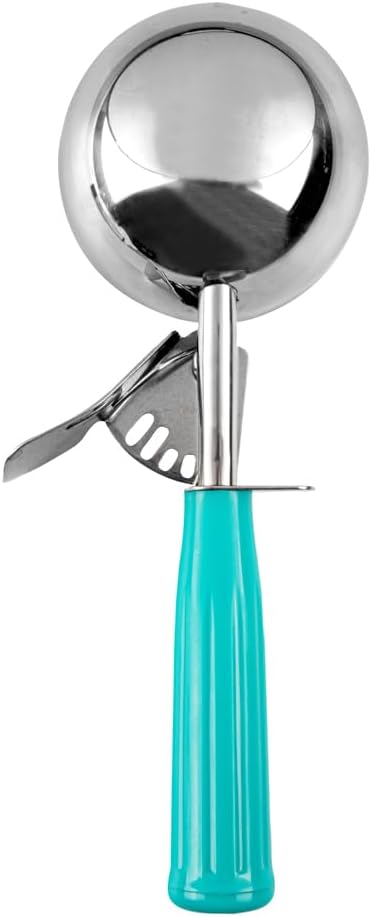 Portion with confidence using our Met Lux 6-ounce Stainless Steel #5 Portion Scoop. Built for high-performance kitchens, this durable stainless steel disher delivers consistent 6-ounce servings, ideal for mashed potatoes, cookie dough, and ice cream. The ergonomic teal handle is color-coded for quick identification and provides a comfortable grip to minimize fatigue during extended use. Designed with a smooth thumb press mechanism, this scoop releases food cleanly and efficiently, enhancing workflow in commercial prep lines. Its oven-friendly and freezer-friendly build adapts to hot or cold applications with ease. Plus, its dishwasher-friendly design simplifies cleanup after service. Measuring 9.75 inches in height by 3.25 inches in width, this portion control tool is ideal for professional portioning tasks. Sold in a 1 count box.