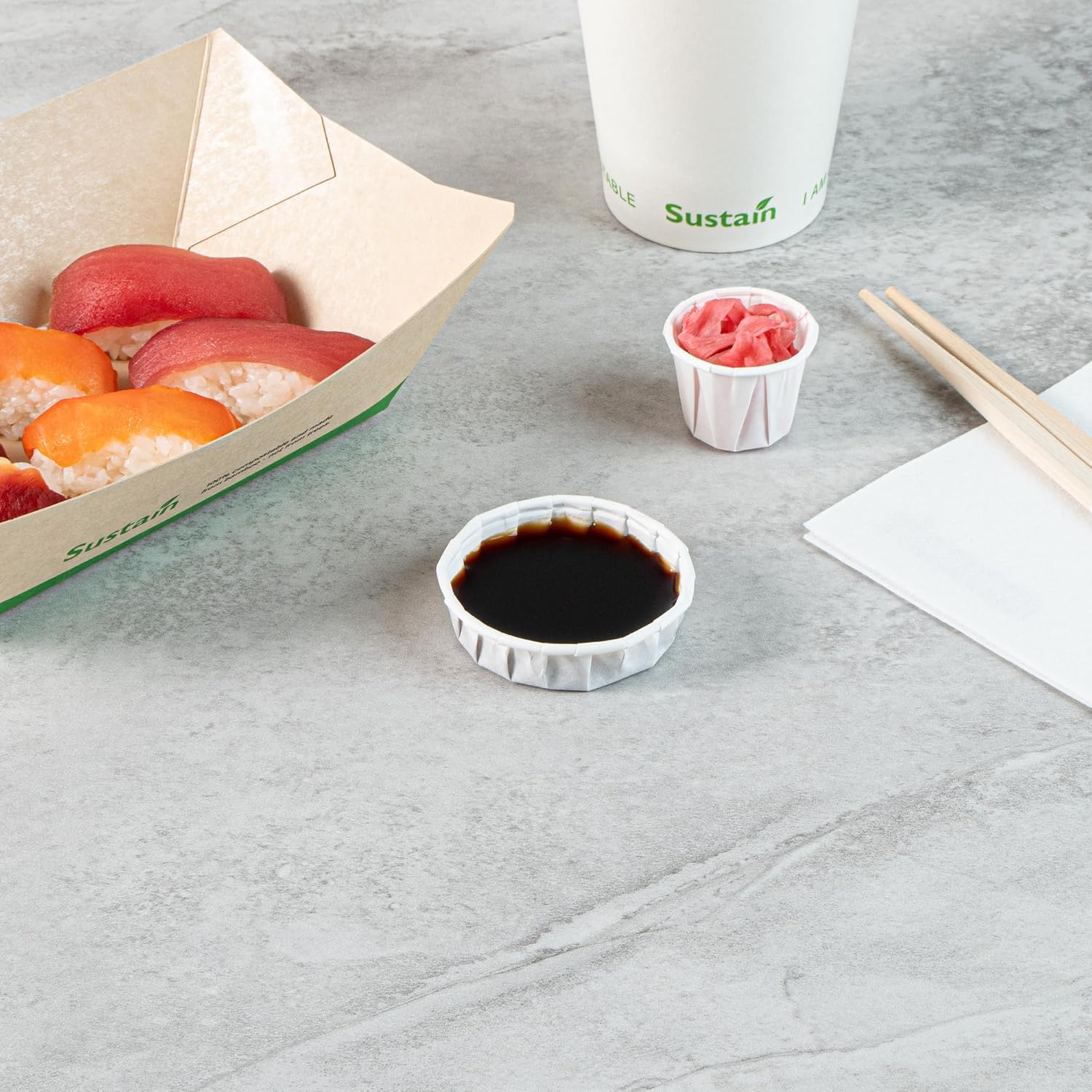 Serve your homemade condiments with our Sustain 1-ounce White Paper Squat Portion Cups. These paper condiment cups are commercially compostable and biodegradable, providing a sustainable alternative to traditional plastic. Made from premium paper, these durable condiment cups hold ketchup, mustard, mayonnaise, honey, and more without leaking. Perfect for serving samples, these versatile sauce cups are ideal for events, tastings, and food promotions. The white finish of these paper ketchup cups enhances your food presentation, making every dish look appetizing. For an easy and straightforward cleanup, these disposable paper sauce cups can be tossed after use. These ketchup cups measure 2.48 inches in diameter by 0.75 inches in height and can hold up to 1 ounce. Sold in a 100 count box. These items will only degrade outside of the traditional solid waste stream.