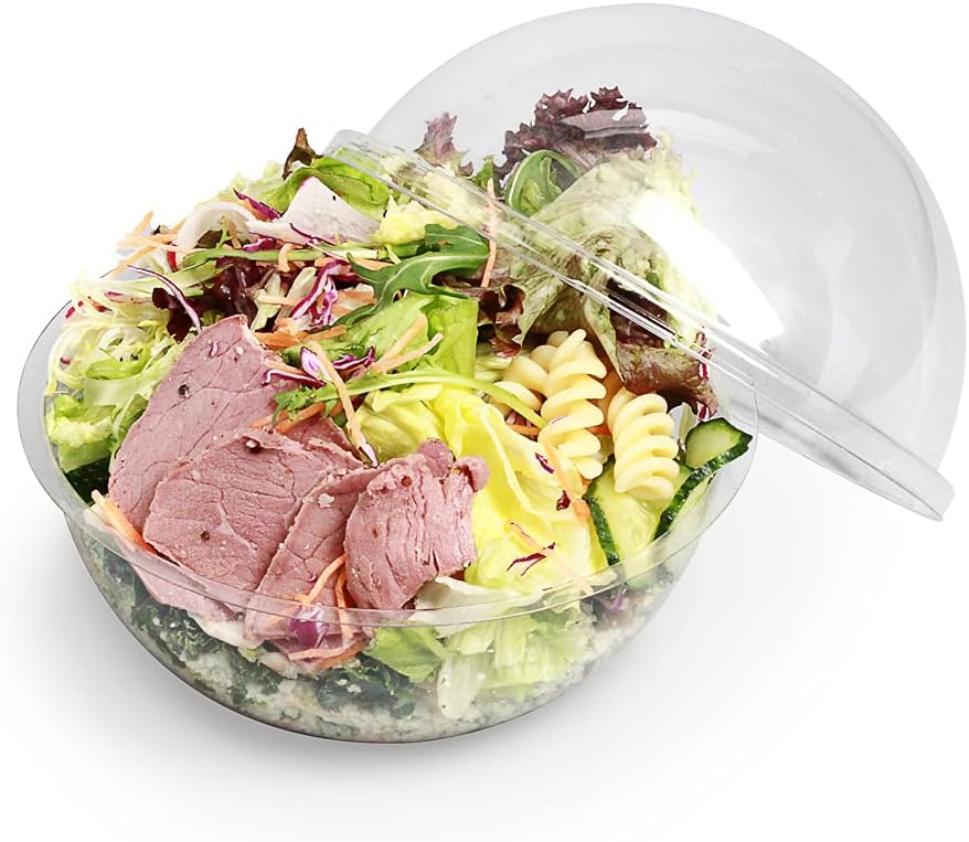 Easily keep meals fresh with our Thermo Tek 28-ounce Clear Plastic Sphere Salad Containers. The included dome lid of these to go containers creates a leak-resistant seal and provides ample space to top off of snacks with garnishes. With a stylish sphere shape, these carry out containers attract the attention of potential customers at your bakery, deli, food stand, or cafe. Designed with a clear finish, these salad lunch containers show off your delicious Greek, Thai, or Italian salads. Constructed from plastic, these food grade containers are recyclable to shorten your after-hour cleanup. Measuring 6.5 inches in diameter by 5.5 inches in height, these plastic to go containers hold up 28 ounces. Sold in a 500 count box.