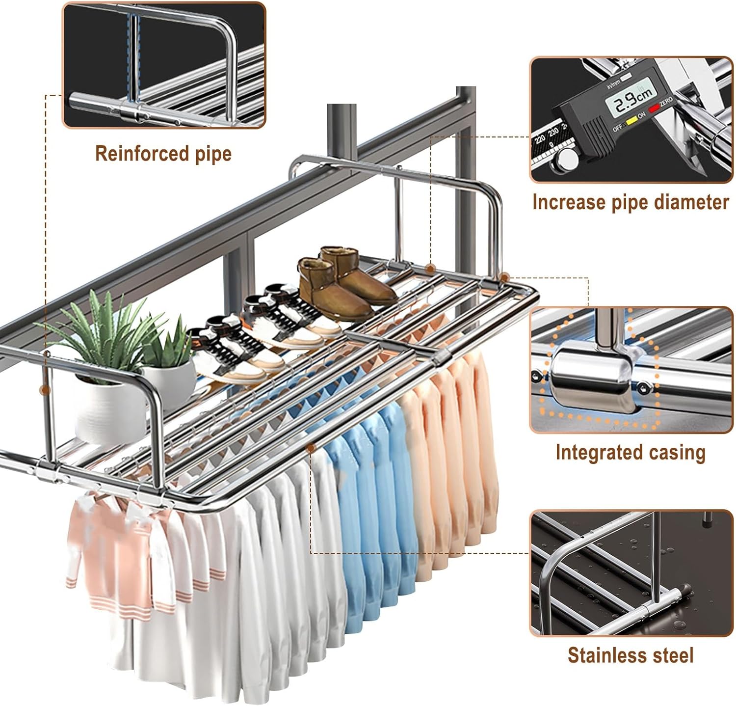 Stainless steel drying rack, portable balcony drying rack, radiator drying rack There are 6 stainless steel tubes, the length can be teles adjusted, so you can hang your clothes on it and hold multiple pieces of clothes at the same time, widening the drying area, speeding up the drying of the whole family's clothes, 10 adjustable window spacing, easy to hang in multiple scenarios, and all kinds of drying space can be comfortably dealt with, folding design, folding and st after drying all the clothes, easy to store, taking up little space, maximizing the saving of space, in addition to the It can be used in balcony, window sill, laundry room, also can be hung on the radiator, winter clothes can dry faster! Name: Multifunctional Drying Rack Material: stainless steel Color: silver Size: 60-106cm, 68-120cm, 78-140cm, 87-160cm Features: retractable, foldable, can be directly hung Use: Wall or window thickness within 16cm/6.3in can be used Suitable for: small apartment, dormitory, heater, balcony, window, shower or doorway, terrace, fence, railing, corridor or heater, outdoor and so on Packing list:1* Hanging drying rack