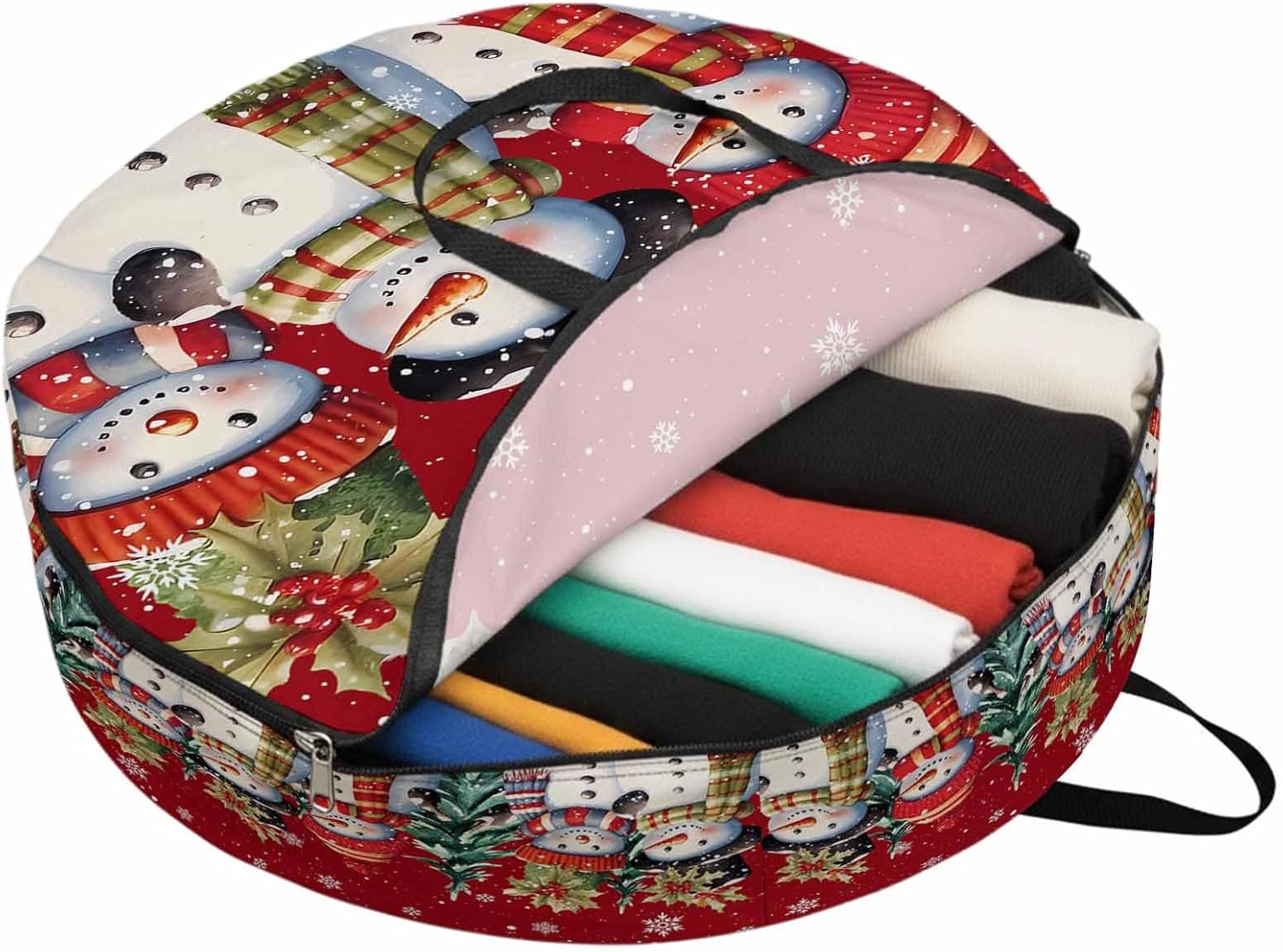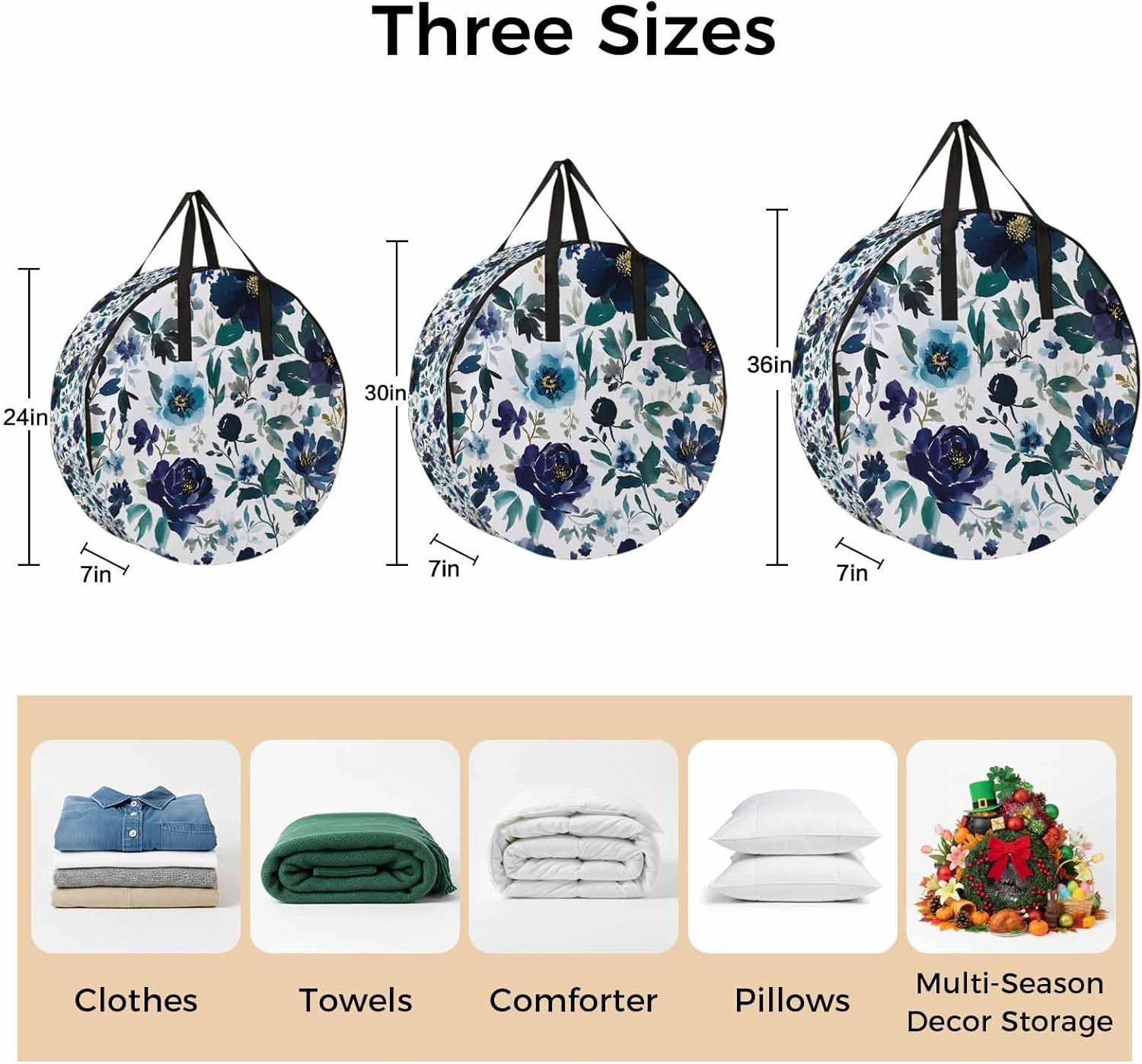Reclaim Your Closet Space with the Round Storage Solution! Material: polyester Diameters: 24 inch, 30 inch, 36 inch Depth: 7 inches Package Includes: Round Storage Bag One Bag, Endless Possibilities: Whether you are swapping out your summer wardrobe, moving into a new dorm, or packing away holiday decorations, this bag has you covered. The circular design is uniquely suited for: Bedding: Comforters, quilts, sheet sets, and oversized pillows. Clothing: Winter coats, sweaters, and bulky ski gear. Home Decor: Holiday wreaths, garlands, and floral arrangements. Outdoor Gear: Camping blankets, sleeping bags, and beach towels. Dual Zippers: The high quality double zipper design allows the closet organizer to open wide from both sides, making it effortless to load and unload even the bulkiest comforters or wreaths. Reinforced Handles: Sturdy, reinforced handles are securely stitched to provide extra strength and a comfortable grip when carrying heavy loads or pulling the bag from under a bed. Clear Label Pocket: A transparent built-in label holder allows you to quickly identify the contents of each bag without ever having to unzip it, keeping your storage perfectly organized.