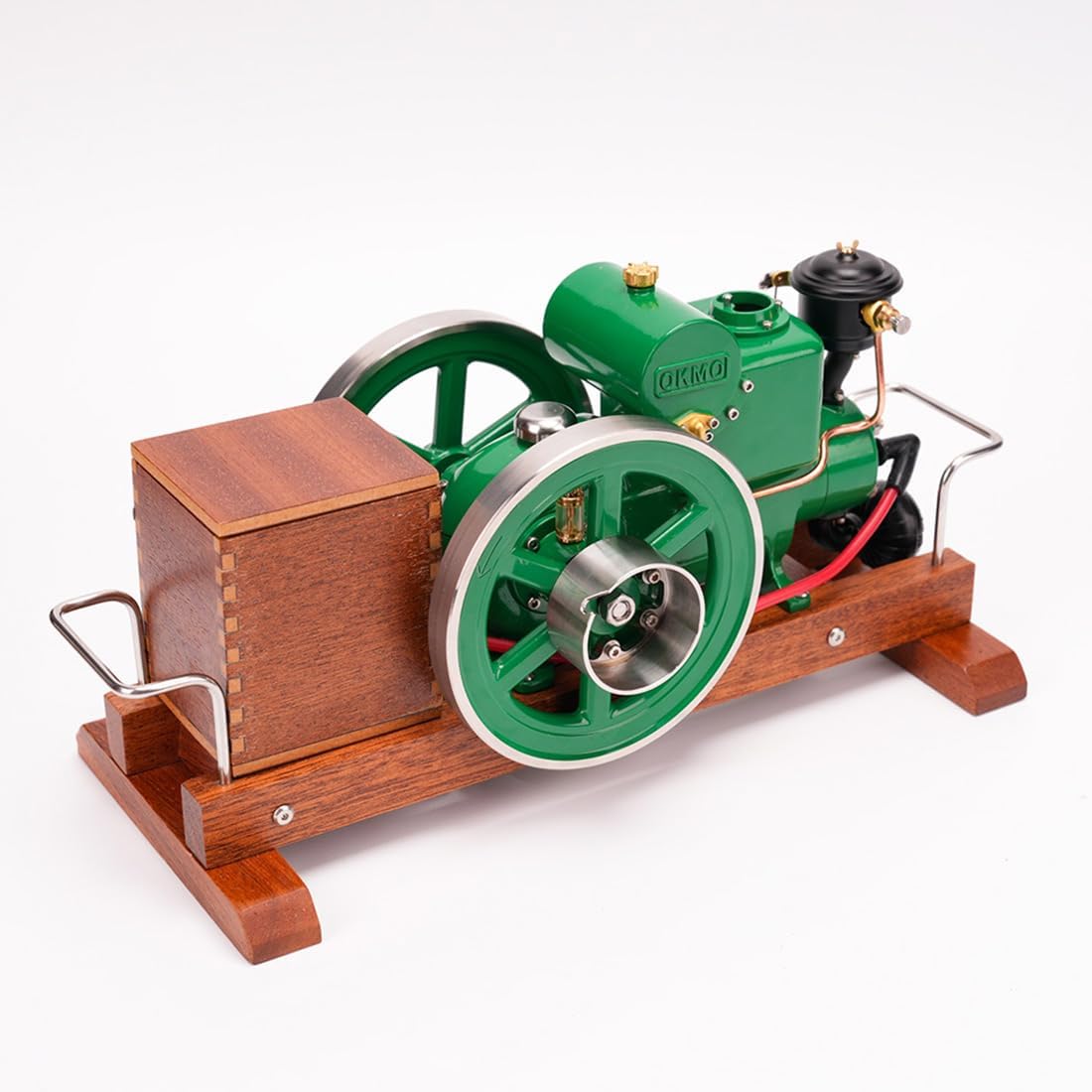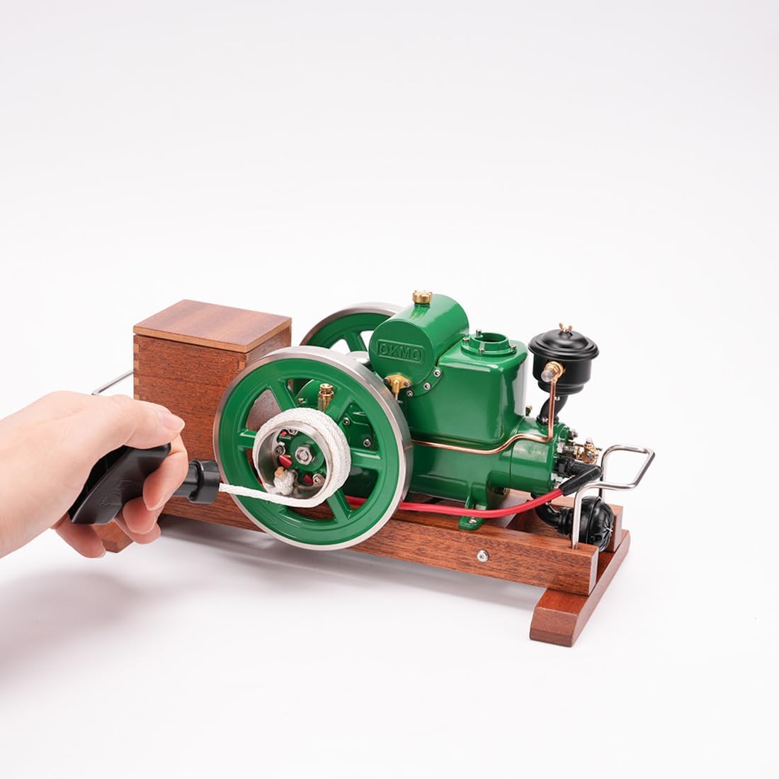 RETROL OKMO Miniature Engine Model with Ignition System and Wooden Display Stand, Japanese Retro Industrial Mechanical Collectible, Christmas Gift for Adults (RTR Version)Specifications:.Material: Brass, Stainless Steel, Wood.Color: Green.Model: 1110.Type: Ready to Run (RTR).Bore: 16.0mm.Stroke: 19.0mm.Cooling: Water.Starting: Manual/Drill Start.Ignition: Mechanical.Spark Plug: 3/16-40 inch thread.Starting Power: 1.5V battery (uses 1 AA battery).Ratio: 25:1 to 30:1.Product Weight: 1810g.Package Weight: 2000g.Product Dimensions: 26 x 12 x 12.8cm.Package Dimensions: 28 x 18 x 20cm.Packing: Graphic Carton.Ages: 16+Packaging includes:.Engine with Wooden Base and Ignition Device *1.Drill Starter *1.Accessory Bag *1.Instruction Manual *1
