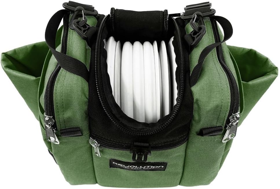The Mini Deluxe Bag V3 is perfect for dedicated players who don't need a full armory of discs to get the job done but need the additional storage for essential extras. With two zippered storage pockets, two oversized 32 oz. insulated bottle holders, and two open putter pockets, the Deluxe MINI Bag can carry 12-18 discs in the main & side compartments and everything you need for your next round. Much like our Carolina Team Bag, the Mini Deluxe boasts a proven design, high-quality construction, and an unmatched level of finish. Revolution's top-selling bag to players of all skill levels. Built around the same patented Disc Cradle foam inserts as the popular Carolina Team Bag, the Mini Deluxe Bag boasts the same proven structure and stability. Similarly, the Mini Deluxe incorporates 1000 Denier Cordura into the main body of the bag while featuring a double-layered bottom for added strength and durability. This bag includes a shoulder strap with the option to add an additional harness and is designed to withstand the daily rigors faced by top touring professionals and dedicated amateurs. Like every Revolution Disc Golf Bag, the back is generously padded and overlaid with breathable netting, offering maximum comfort and ventilation.