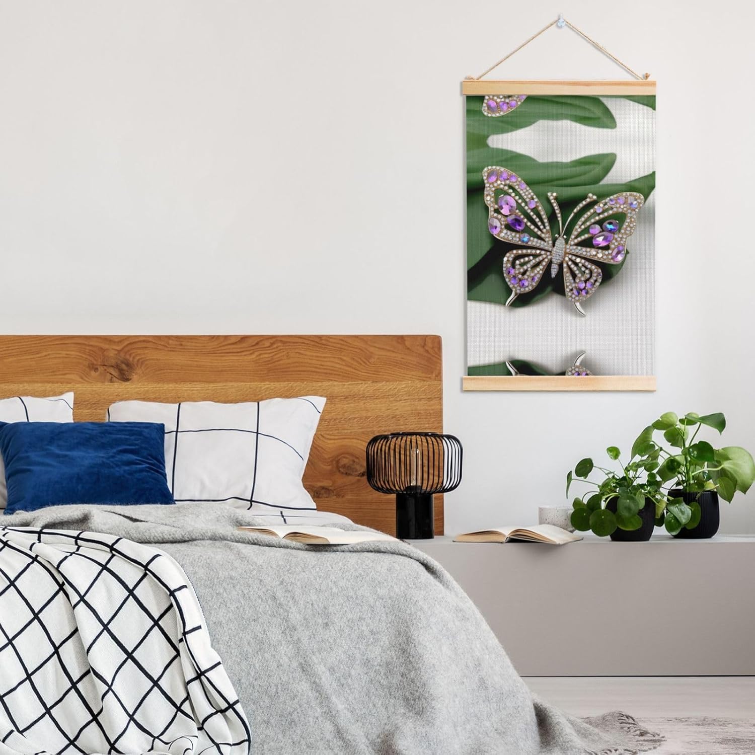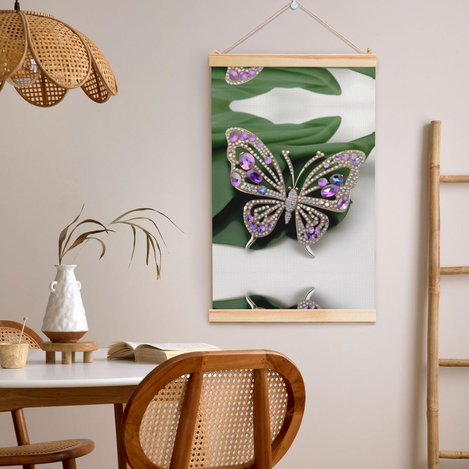 Our Rhinestone Butterfly Print Wooden Poster Hanger Is An Excellent Addition To Your Home Decor Or A Perfect Gift For Friends And Family. Made Of Selected Quality Canvas With Brilliant And Enduring Colors, This Wall Art Is Designed To Resist Water, Dust, And Fading, Ensuring The Bright And Vibrant Art Lasts. The Polyester Is Enclosed Between Two Teak Wood Hanger Scrolls With An Attached 35cm Rope For Easy Hanging. Installation Is Made Simple With The Included Two Nails In A Plastic Box. The Modern Minimalist Style Of Our Wall Hanging Complements Any Home Decor, Elevating The Artistic Ambiance And Brightening Up The Room. Experience The Elegant Transformation This Wall Hanging Scroll Painting Brings To Your Spaces Today.