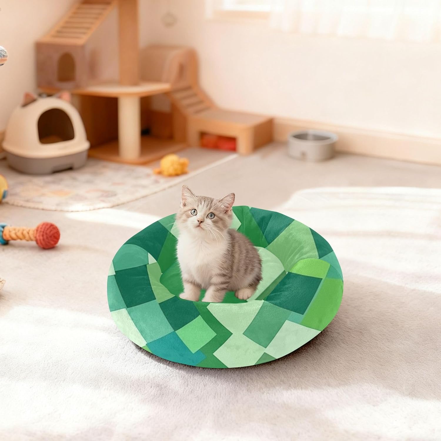 Size: XS: Diameter: 13 inches(sleeping area diameter: 10.2In); S: Diameter: 15.7 inches(sleeping area diameter: 13In); M: Diameter: 20 inches(sleeping area diameter: 17.3In). A donut-shaped Dog Pillow Bed that allows puppies and kittens to curl up and relieve anxiety. Material: Polyester + Filled + Drip Plastic. Our Dog Pillow Bed features a donut-shaped appearance design and is filled with silk-like cotton inside. It has excellent elasticity and fluffiness, providing comfortable support for pets and relieving joint pressure. Product Design: The overall shape is circular, with smooth and gentle lines, which conforms to the Safaris of pets who like to curl up and can give pets a full sense of security. Dog Pillow Bed edge part will slightly bulge, forming a soft cushion that pets can lean on and also prevent them from rolling off while sleeping. Applicable Scenarios: This comfortable bed can be used by pets such as cats and dogs. Dog Pillow Bed can be used in scenarios such as living rooms, floors, sofas, cages, and cars. Easy To Care: Can be hand-washed or machine-washed. A machine-washable Dog Pillow Bed makes it easier for your pet to stay in a comfortable and clean sleeping space.