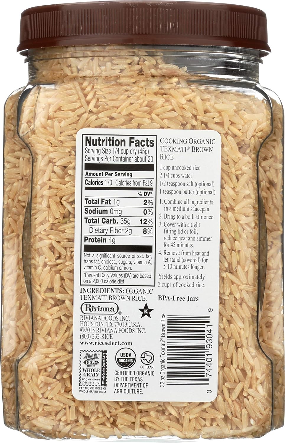 Long Grain American Basmati. 100% Certified Organic. USDA Certified. Low carb friendly. Flavored by nature. Nutritious whole grain. Certified Organic by the Texas Department of Agriculture. Makes approximately three cups of cooked rice.