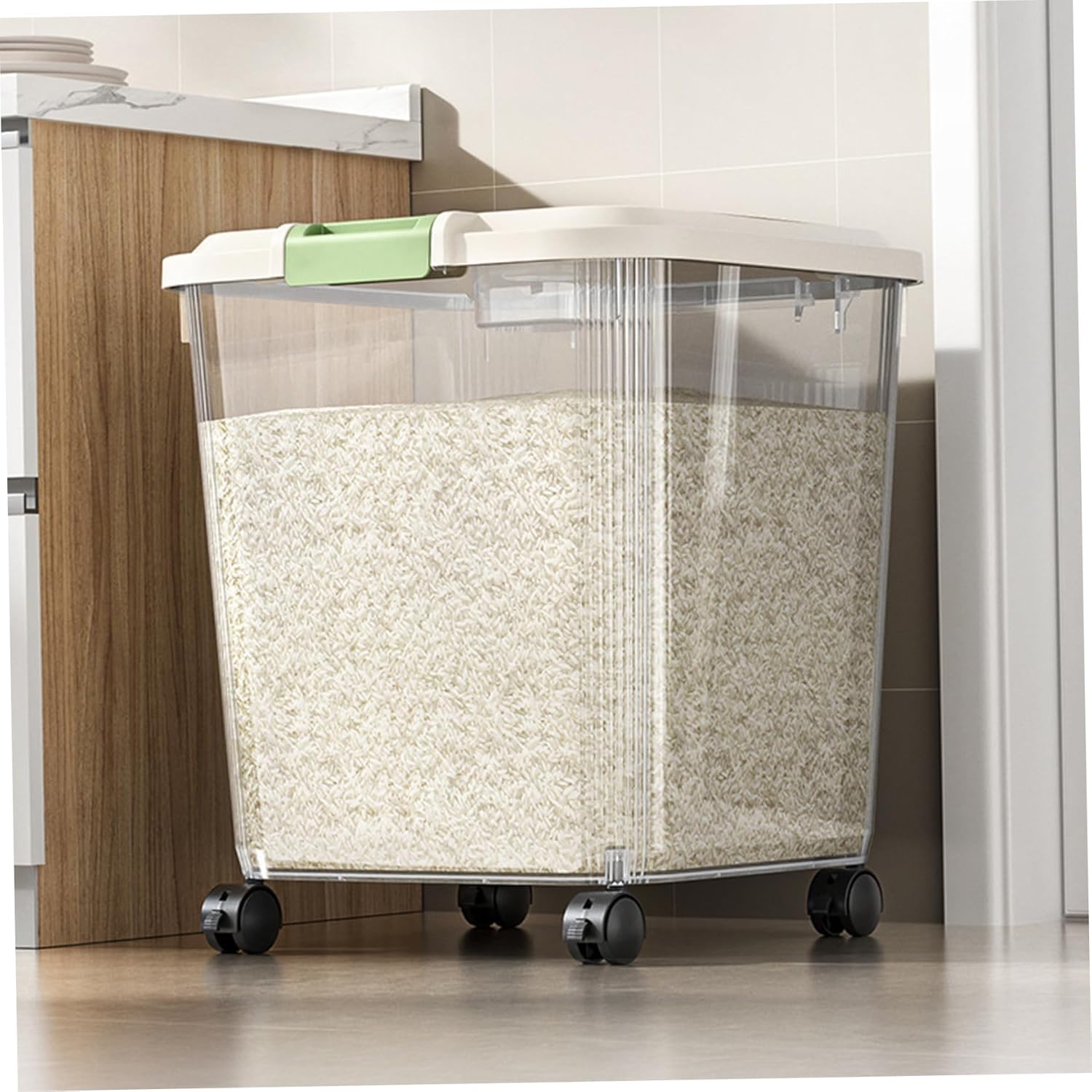 Description: Organize your pantry and protect your dry goods with our clear, large-capacity storage container. Designed for everyday convenience, this bin helps keep your kitchen staples like rice, flour, pasta, and cereals in one secure, accessible place. Crafted from stable, food-safe plastic, this container is a reliable option for storing food. The tight-sealing lid creates a barrier against air and humidity, which can help preserve the texture and quality of your ingredients. Its sturdy construction is built to handle the weight of up to 33 pounds of contents. The clear sides provide immediate visibility, so you never lose track of what's inside or when it's time to restock. No more digging through opaque bags or bins. When it's time to clean or rearrange your space, simply tilt the container and use the integrated wheels to glide it to a new location without heavy lifting. Ideal for use in your kitchen, garage, or utility room, this versatile storage solution works great for pet food, bird seed, or craft supplies. Simplify your storage and maintain a clutter-free home with this practical and mobile rice storage container. Features:. -Color: White. -Material: Plastic. -Size: 37.5×30×30 cm / 15×12×12 inch. -Capacity: 15 kg /33 lbs. Note:Manual measurement, please allow slight errors on size.The colors may exist slight difference due to different screens. Package Including 1 * Rice Containers