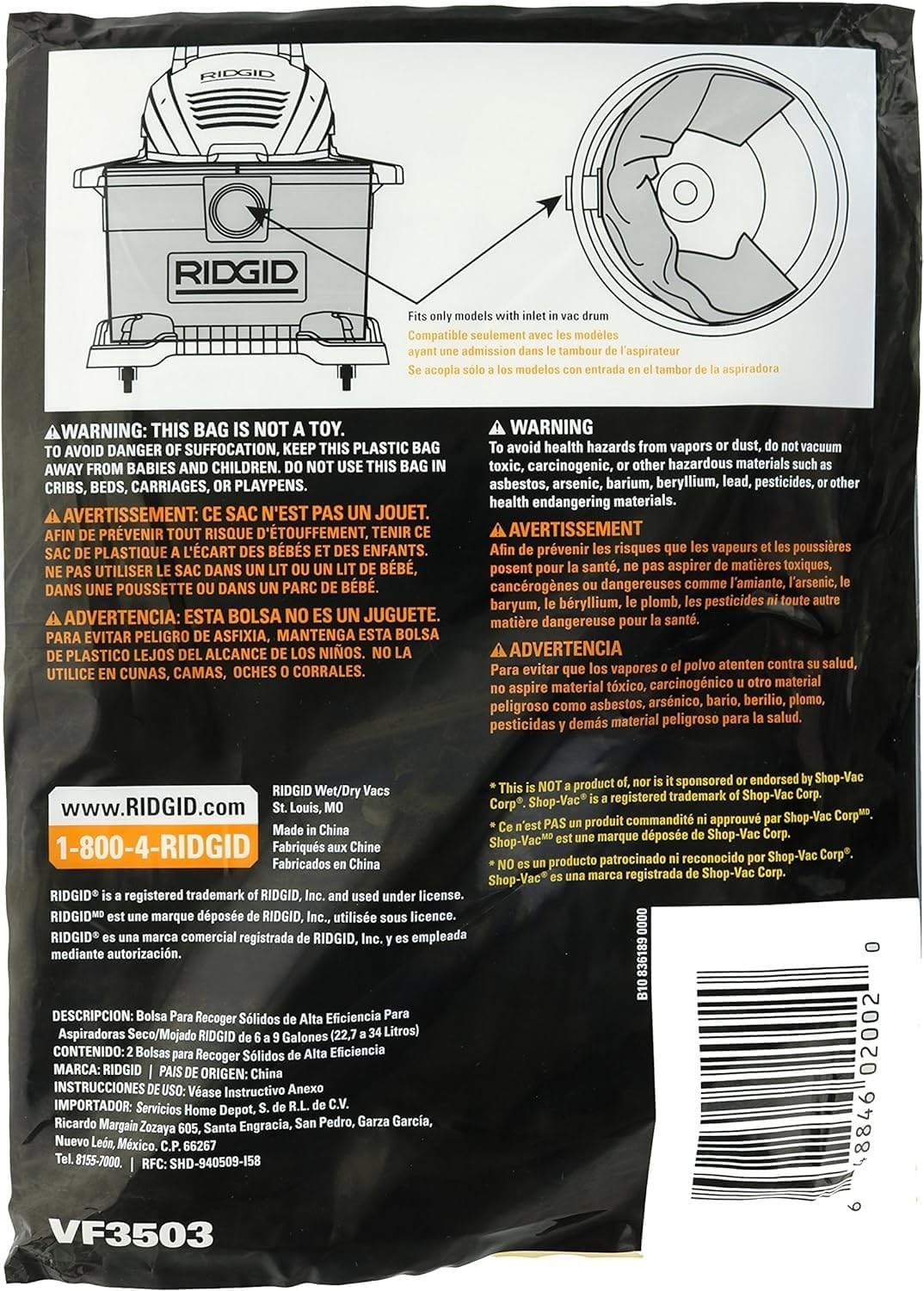 | Compatible Vacuum Cleaner Models | RIDGID 1000RV, RIDGID HD0900, RIDGID HD0918, RIDGID WD0670, RIDGID WD0671, RIDGID WD0970, RIDGID WD1022, RIDGID WD1060, RIDGID WD5500, RIDGID WD6425 |