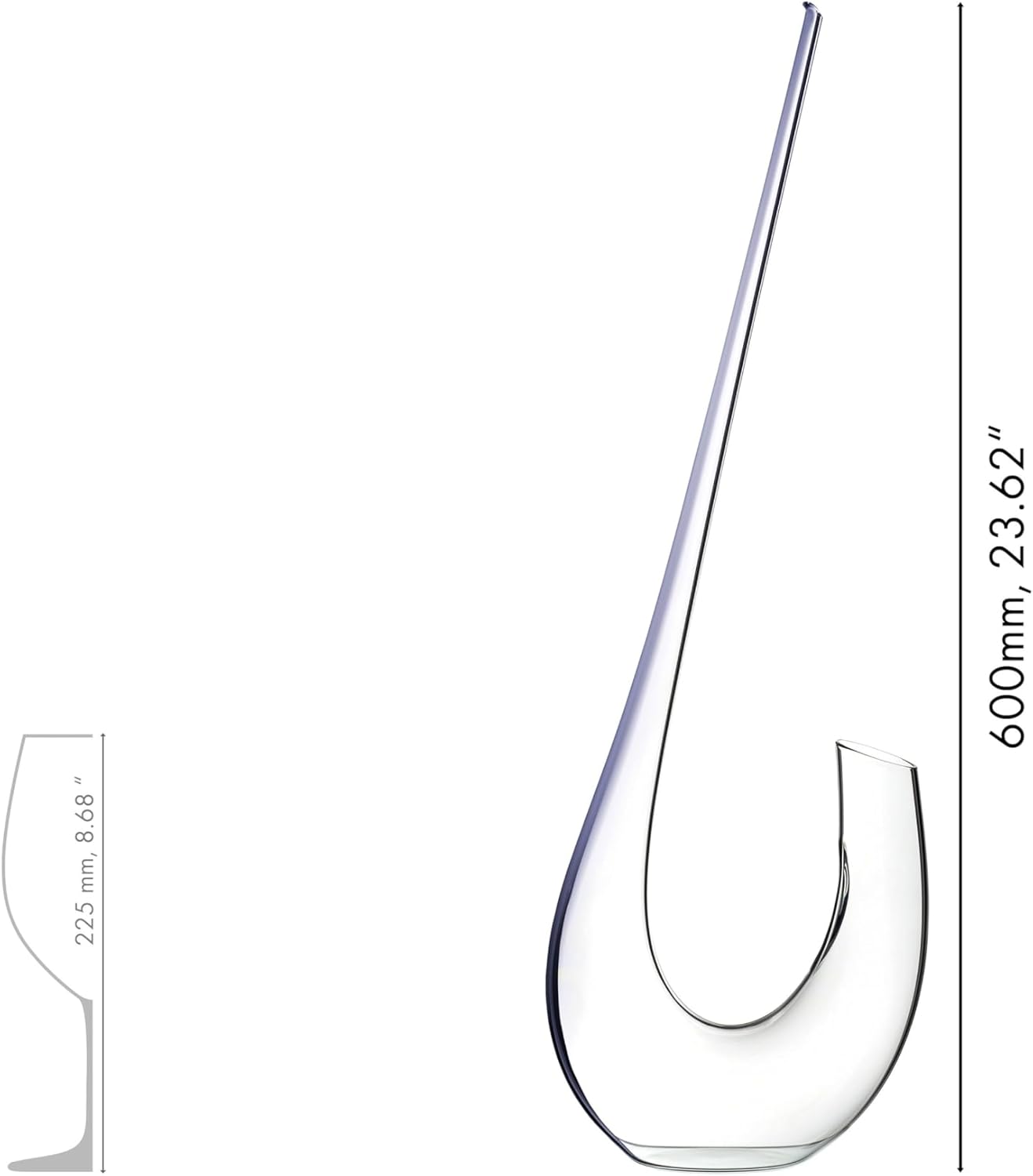 The RIEDEL Winewings decanter is a colorful and elegant re-creation of RIEDEL's Swan decanter as a compliment to the Winewings glass series. First designed in 2008, Swan's striking elongated curves make it an incredible statement piece, with the grace of a beautiful bird. Wine is gently decanted through the large opening then poured from its exquisite neck - long enough to reach any guest at the dinner table! The new iteration of this decanter, at the same soaring height but a slimmer design, now also includes an indented handle for easier pouring. This piece features a lavender purple stripe through the design, achieved by introducing a rod of purple crystal into the molten glass before the decanter has been formed. This pack contains a single piece. This product is handmade. Please handwash only. The RIEDEL Bottle Cleaner cannot be used with this product as they can become lodged and unable to remove