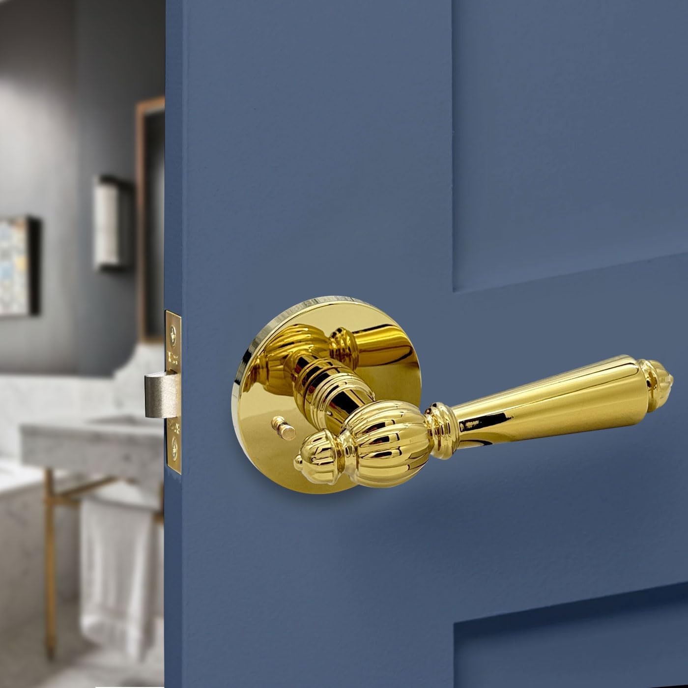 Receive: (3) High Polish Brass Gold Door Handles. These interior privacy door levers are perfect for spaces that require privacy, such as bedrooms and bathrooms. Gold door handles from Rio Salto. High polish = shinny gold. Elevate the look of any room with our High Polish Brass Decorative Gold Door Handles. Crafted for both style and durability, these handles feature a stunning, reflective finish that adds a touch of luxury to your doors. The rich gold tone complements a variety of interior designs, from classic to contemporary, while the polished brass ensures long-lasting quality and a timeless appeal. Perfect for homeowners who want to make a statement with every detail. Easy Installation: Designed for standard doors (1-3/8" to 1-3/4" thickness), this lever set is simple to install with just a screwdriver. Reversible handle fits both left and right-handed doors. Durable and Secure Construction: Crafted from premium materials for enhanced durability and reliability. Provides secure closure and smooth operation for years. Versatile Home Upgrade: Perfect for residential or commercial use. Enhance the look and functionality of your doors with this stylish, polished gold lever handle set—ideal for modern, contemporary, or classic interiors.