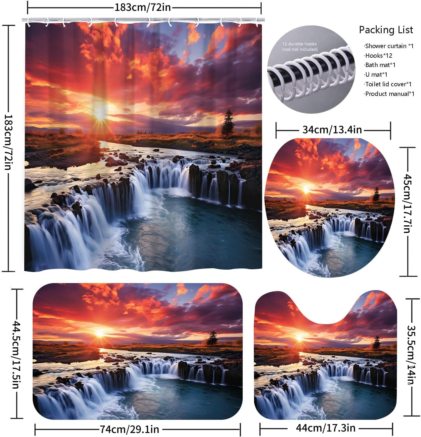 Our 4 piece bathroom set - Bathroom mat, stylish shower curtain, comfortable toilet lid cover - Can easily match your bathroom style!Feature:1. Material - Shower curtain is made of polyester fabric, which is waterproof. Bathroom mat and rug: Thickened memory foam + flannel surface, soft and more comfortable2. Pattern Printing - Our bathroom decor set are printed with HD pattern printing technology, colorfast, friendly and reliable. It can make the bathroom more lively and interesting.3. Private - Shower curtain protect your privacy, anti-dust, easy to hang.4. Easy to Install - The shower curtain comes with 12 hooks, allowing the shower curtain to slide freely and smoothly. The non-slip mat and shower mat has a bottom dotting non-slip design to ensure safety while stepping in and out of the shower.5. Washing Method - Hand wash or machine wash in cold water, hang to dry, do not bleach.Product Size: Shower curtain measures 72 in x 72 in, Bathroom mat measures 29.1 in x 17.5 in, Toilet Lid Cover measures 17.7 in x 13.4 in, U shape rug measures17.3 in x 14 in,U-shaped and toilet lid cover mats, Fits most bathroom toilets.Package Including:1 × Shower Curtain1 × Bathroom Mat1 × Toilet Cover1 × U-shaped Rug12 × Plastic Hooks1 × Product ManualAttention Please:Shower curtains and rugs will have creases during shipping. The shower curtain will be more beautiful after ironing, the creases of the carpet will disappear after soaking in water for a while, and will disappear when you take it out and unfold it.