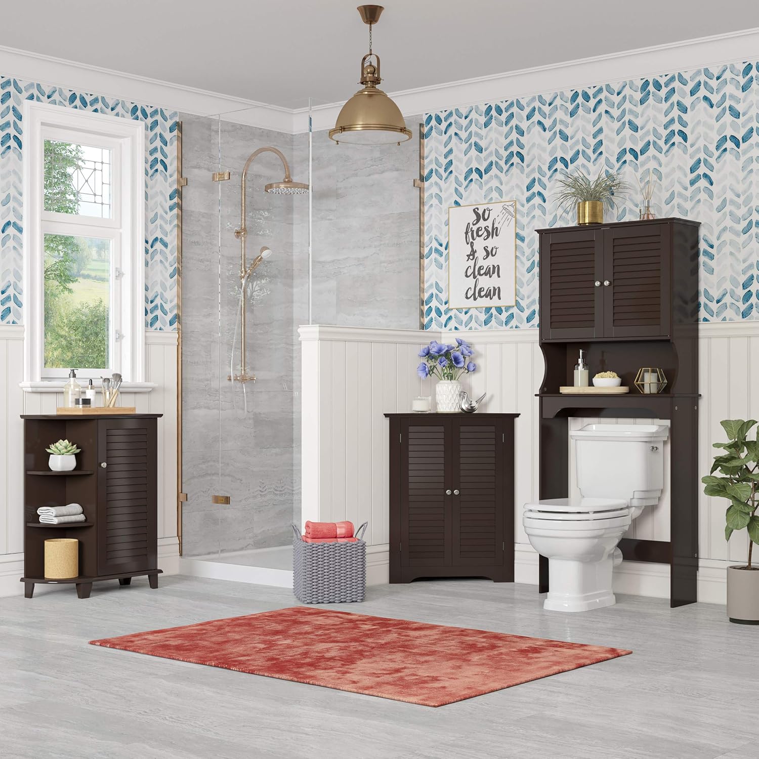 Make the most of small bathroom layouts and create more functional bathroom storage space with the RiverRidge Home Ellsworth Collection-Spacesaver Cabinet. Additional dimensions: Top shelf: 27.36"W x 9.25"D, fixed open shelf: 25.25"W x 8.5"D, interior fixed shelf: 25"W x 7"D, and space between: fixed shelf/cabinet-10" floor/fixed shelf-32.25"H.