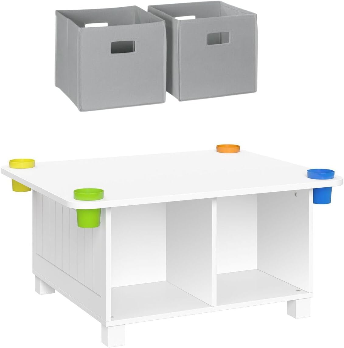 Versatile Sensory Table for Creative Play Our multifunctional sensory table offers ample organization and storage options. With 4 spacious cubbies, it serves as an excellent toy storage organizer. The cube storage design allows for easy arrangement of art supplies, books, and toys. Paired with the 2 included foldable fabric storage bins, this table provides a stylish solution for keeping your child's space tidy and organized. Inspiring Kids Table for Arts and Crafts Transform any room into a creative hub with our kids desk. Designed as an art desk, it features a scratch-resistant surface for hassle-free clean-up after messy projects. This craft table with storage includes 4 colorful removable cups, for organizing pencils, crayons, and markers. The contemporary white finish and beadboard detailing ensure it complements various room decors. Durable Desk for Kids' Activities This robust art table is built to withstand daily use. As a table for kids, it boasts a weight capacity of 75 pounds on the tabletop and 20 pounds per cubby. The kids' activity table's sturdy construction from white-painted MDF ensures longevity. Measuring 30.47" W x 24.88" D x 14.13" H, this desk for kids fits comfortably in any space, providing a dedicated area for learning and play. - Versatile kids desk, activity table, and play table - Scratch-resistant surface for easy cleanup - White-painted MDF construction with beadboard detailing - 4 storage cubbies for toys, books, and supplies -Includes 2 foldable fabric storage bins - Includes 4 removable cups for organizing art materials