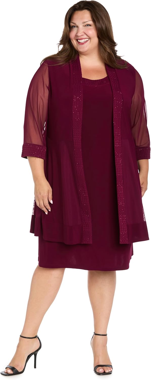 Elevate your wardrobe with this elegant choice from R&M Richards, designed for women who appreciate elegance with ease. This ensemble pairs a sleek, comfortable sheath with a breathtaking pleated mesh duster. Accented with shimmering jacquard trim, it offers a layered look that feels light, luxe, and undeniably confident. Designed for the woman who commands the room with grace.