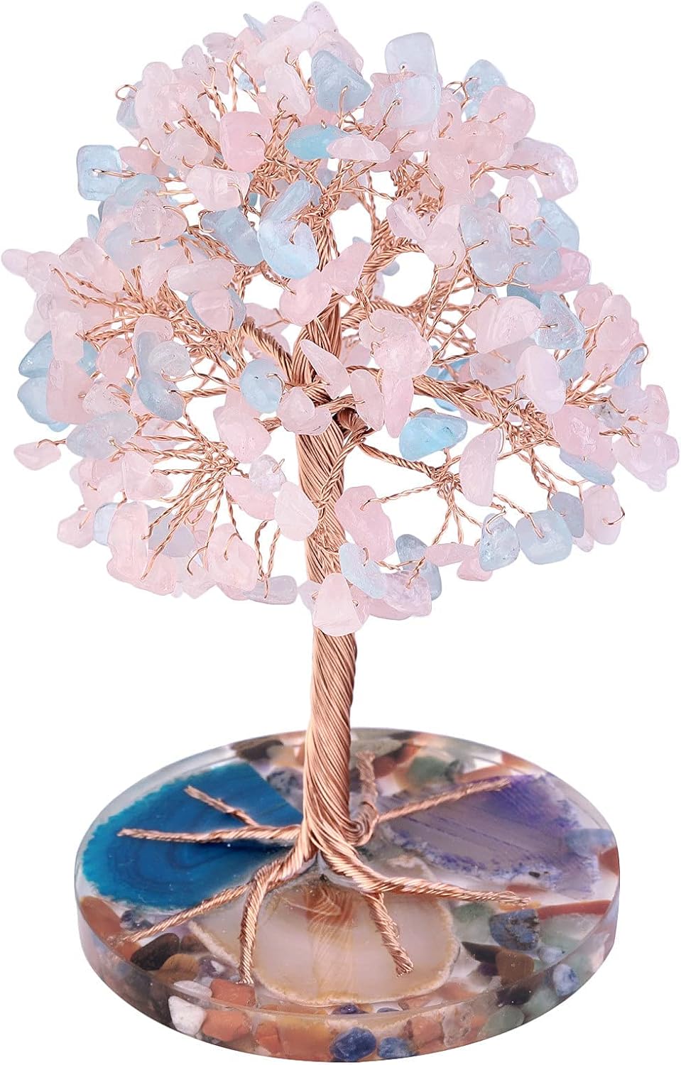 The Product is a Bundle – 2 items:1 x Natural Raw Blue Celestite Mineral Healing Crystal Cluster Geode Irregular Home Decoration Gemstone Specimen Large1 x Rose Quartz & Aquamarine Crystal Stone Money Tree with Agate Slice Base Bonsai Tree Feng Shui Desk Decoration for Wealth and Luck, for Home Decoration 4.7"-5.5"Due to two items being made of natural stones, each stone may vary slightly in size, color, and shape. All these crystals are full of pure and eternal energy bringing luck and wealth, and creating positive energies. Rose Quartz, with its gentle pink essence, is a stone of the heart, a crystal of unconditional love. Aquamarine can stabilize and develop the reiki, maintain the connection between people and life, relieve people's anxiety, and improve the ability to work in logical thinking. Celestite brings harmony and balance and will assist the holder in finding and maintaining inner peace. Nowadays, more and more people want a one and unique wedding instead of the traditional floral decoration wedding. And these crystals’ style is a good choice for you or the one you love! It is well known that crystal symbols are true, pure, and eternal love. Our crystals well-packed in an elegant black velvet bag are the best gift choice for awesome Christmas, Housewarming, Birthday, New Year.