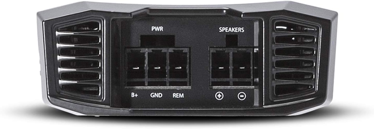 The Power T500X1br is a compact, patented 500 Watt mono amplifier, leveraging Rockford Fosgate's Boosted Rail technology for efficient power usage and extended peak performance. It offers high-level auto turn-on, input/output clip detection, top-mounted controls, and dual fan forced cooling. This versatile amplifier is suitable for various vehicles, including hybrid, electric, small cars, trucks, motorcycles, and side-by-side UTVs.