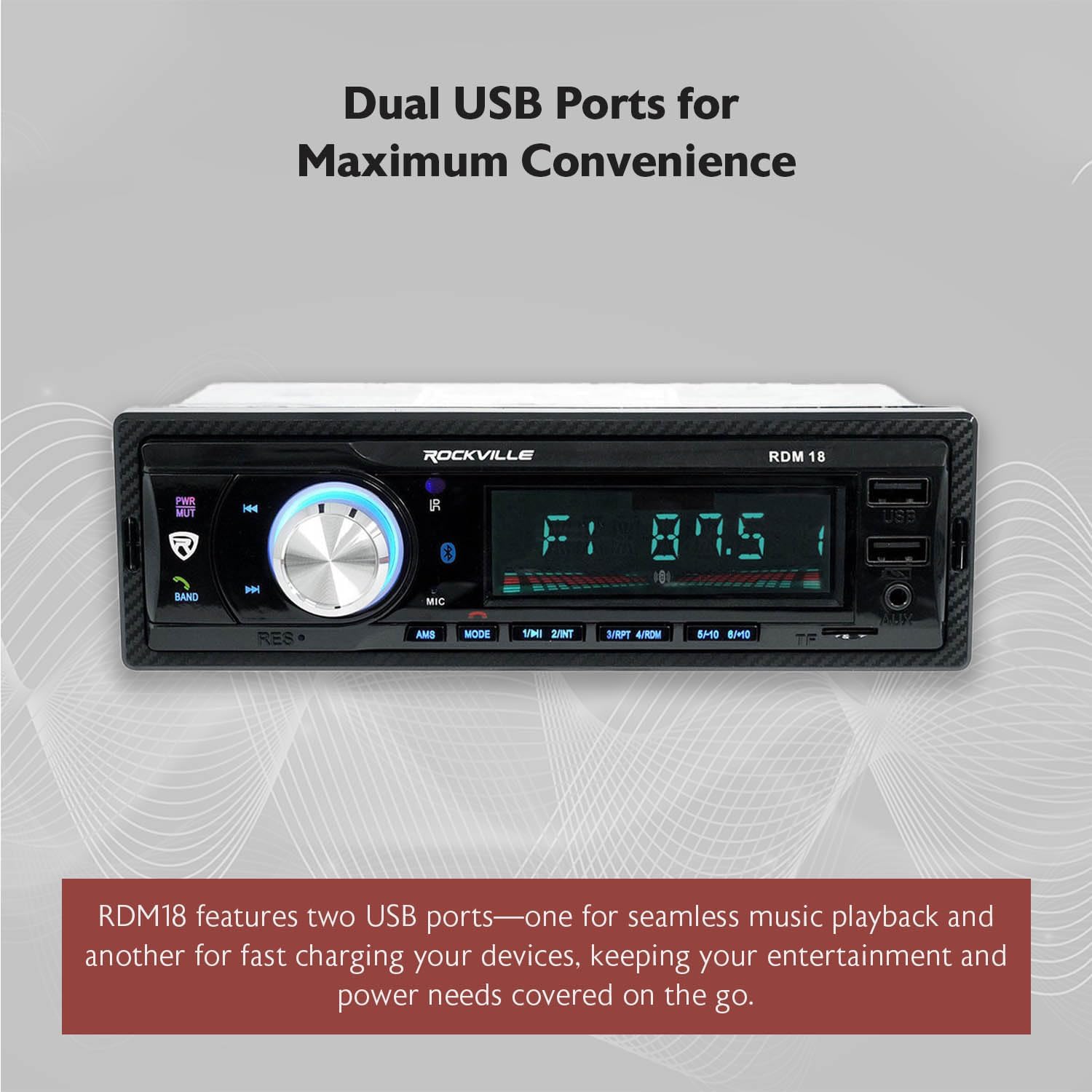 The Rockville RDM18 digital car media receiver is a very simple product to use and it functions and sounds great! This is a digital media receiver which means it does not have a CD player built into it. Not to worry though! Who really uses CD’s these days? Instead you get Bluetooth streaming, USB input for music, USB charging port, an SD card slot, and a front aux input. You also have your standard AM/FM radio with presets. Our SD slot has a max capacity of 32GB. (Other receiver usually only support up to 8GB. The thing about this model that we are most proud of is the built in amplifier. We spent some extra money manufacturing this with an upgraded amplifier. It is 50x4 watts peak and 17x4 watts RMS. The amplifier built into this receiver is almost the exact same as the leading brands on the market. This receiver also has a 2 band equalizer built in with adjustable EQ curves (rock, pop, flat, etc).