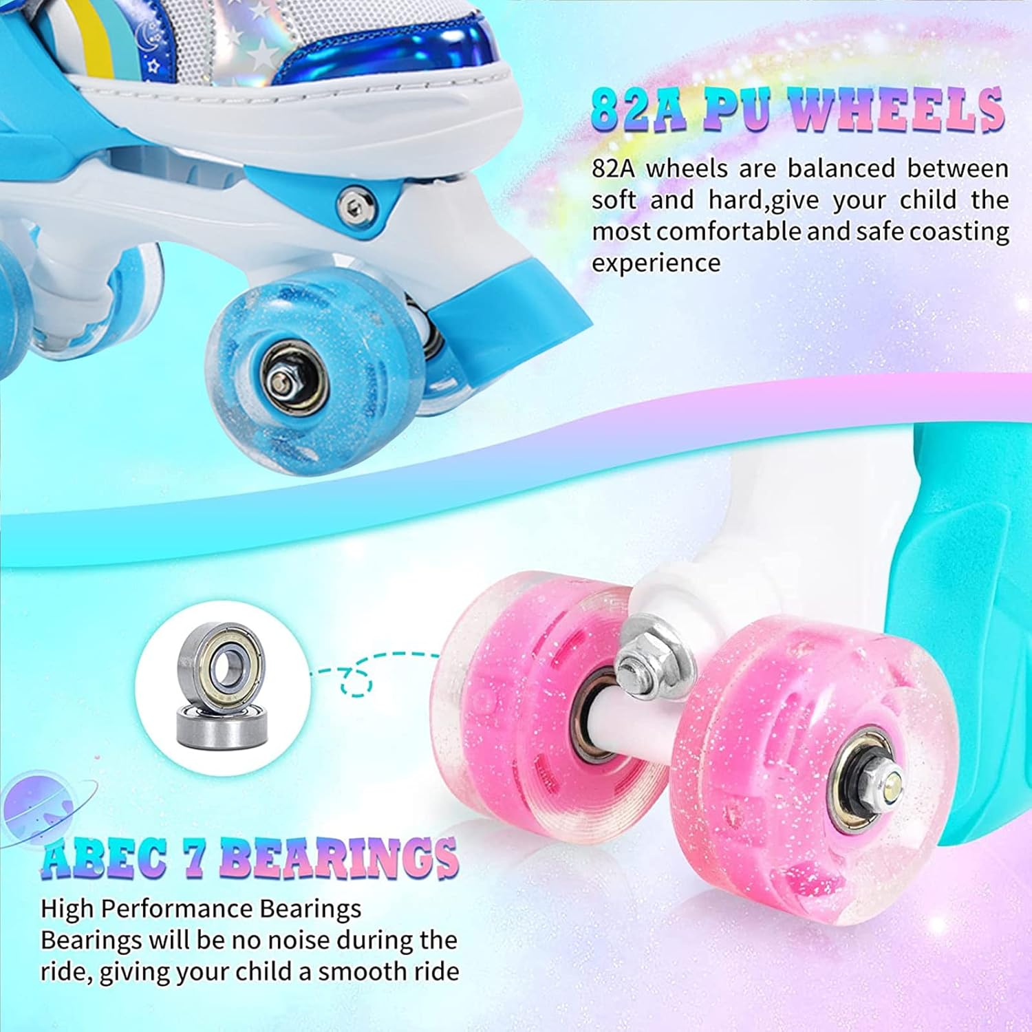 Kids Skates, Double Row Roller Blades Skate for Kids Beginner, Roller SkatesRoller Skates with 8 Light Up Wheels, Adjustable Size Outdoor Skating for Girls, Boys, Kids.Product Category: roller skatesUpper Material: mesh, PU leatherSole Material:TPRWheel Type: Double RowColor: pink, blueSize: Small(10C-13C)/Medium(1Y-3Y)4 Size Adjustable Roller SkatesKids roller skates each shoes size can be easily adjusted to 4 different sizes. Kids simply press in the locking button and slide the skate to increase or decrease the size. It is very perfect for growing up kids.Soft and BreathableTriple Safety Protection Design.Adjustable High-strength Fixing Buckle, Velcro Strap, Shoelaces.The lining material is soft and breathable, and not stuffy foot. The thickened lining has good shock absorption effect, protect your kids feet.Rainbow ColorThese roller skates are designed in rainbow tones, the colorful colors are not only vibrant, but also eye-catching, wearing these roller skates can make children the most eye-catching existence in the process of playingChildren's GiftRoller Skates is surprising gift for birthday, holiday,special event to kids.Roller skating can be an excellent way of being physically active and improve children’s mood and reduce stress while having fun.Customer ServiceContact us if you are not satisfied with our product, If you have any question about this roller skates, we will happily accommodate and work with you. All issues will be solved within 24 hours.