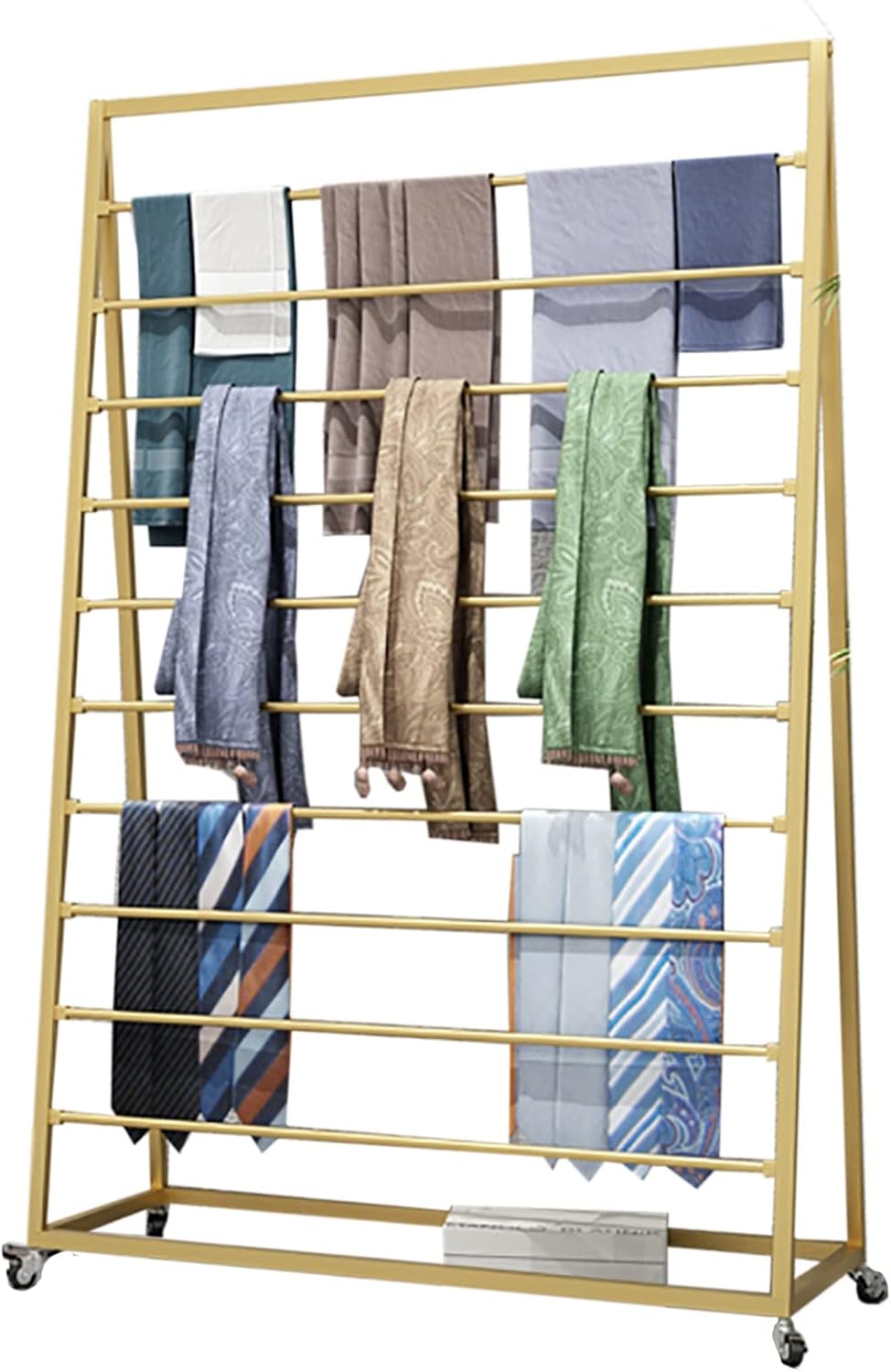 Description: This multifunction rack is an excellent choice for home, store for all types of items! A metal finish gives the rack a polished look while durable construction ensures that you won't have to deal with a rack that won't last. Specifications: Material: Metal Iron Color: Gold Black Style; Modern Size: 100*40*150/39.4*15.7*59in Multi-Purpose: Suitable for scarf, silk scarf, belts, pants, etc Scenes: Home, clothing store, apartments, hotels, closets, etc Features: Heavy weighted base for stability. The scarf rack organizer is made of the strong steel with a durable rust-resistant finish. All tools included. Follow the step by step instruction to assemble effortlessly. universal standing rack fits along a wall, in a corner, or anywhere you need smart organization. Package Includes: 1 x Scarf Rack Note: There may be an error of 1-3 cm due to manual measurement. There may be chromatic aberration due to the difference between the recording lamp and the display. Please refer to the actual product.