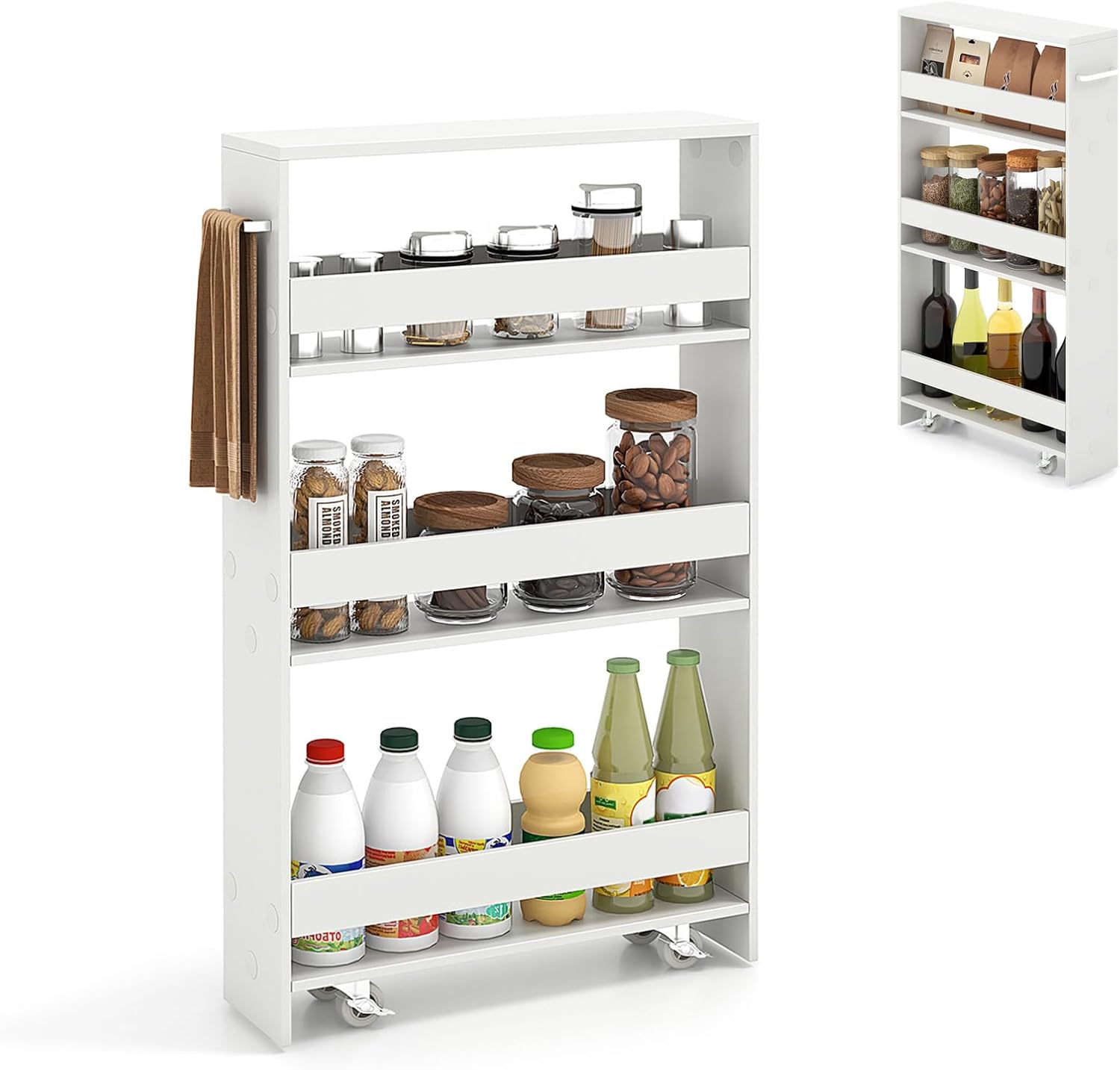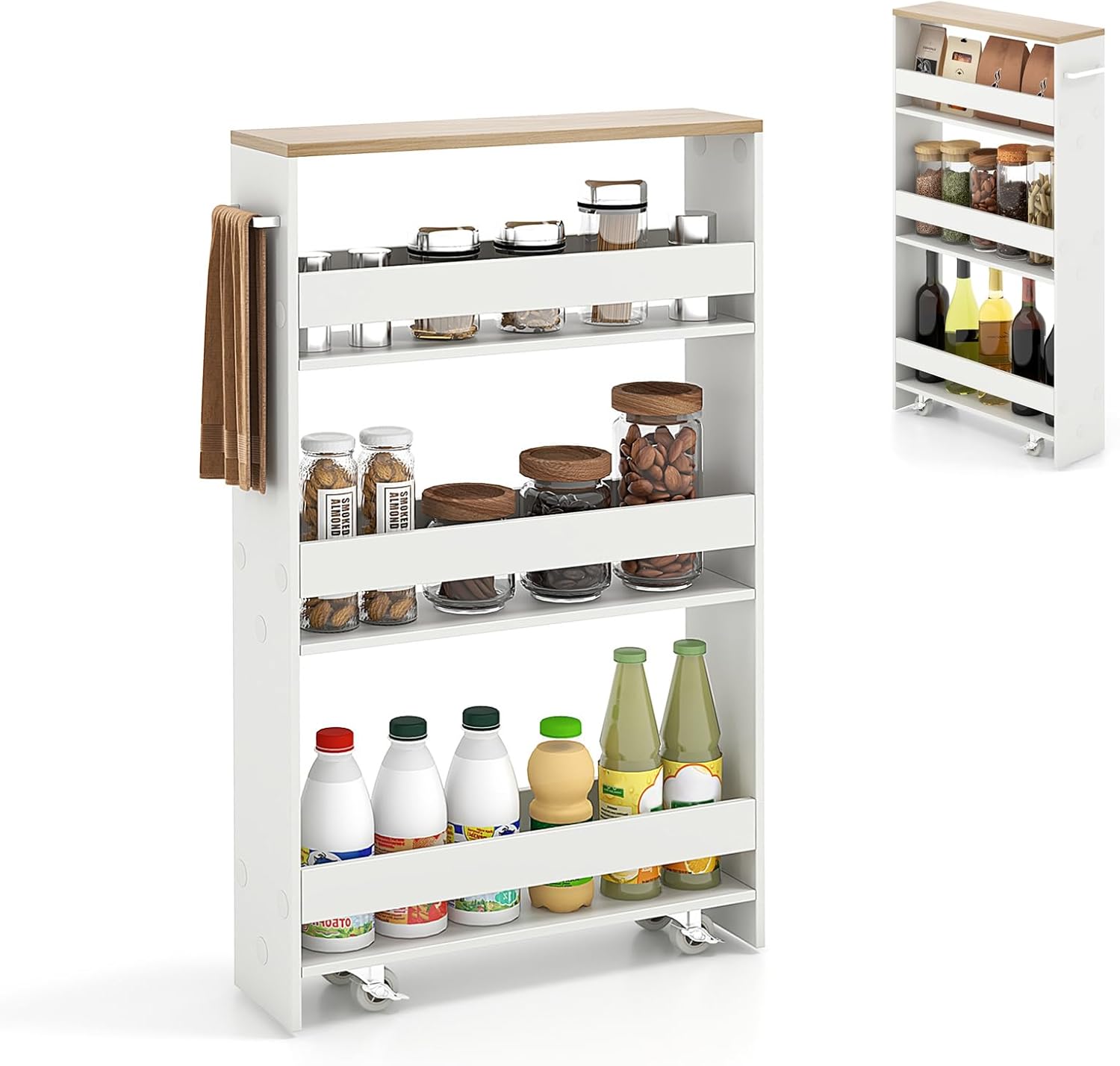 Description:Revitalize your home’s efficiency with this intelligently designed 4-tier organizer.Perfect for compact living, its slim profile effortlessly fills narrow gaps while offering generous storage across 4 accessible shelves. The open design ensures quick visibility and retrieval of items, from kitchen spices to bathroom necessities. Built to last, the storage cart features reinforced panels and smooth-gliding casters for seamless relocation. Whether prepping meals, tidying hobbies, or hosting guests, this cart adapts to your needs, keeping every room clutter-free and effortlessly functional.Features:Space-efficient dimensions ideal for corners or tight layouts4-tier shelving system for categorized item placementStable protective bars on each shelf to secure contentsDual-lock casters for flexible mobility and stationary safetySide grip handle for easy maneuvering and accessory hangingReinforced frame construction for consistent daily useMulti-purpose functionality across kitchens, bathrooms, and living spacesSpecifications:Color: White/Black & Natural/White & Natural/GrayMaterial: Engineered Wood, MetalOverall Dimension: 19” x 5” x 32” (L x W x H)Shelf Height from Top to Bottom: 7”, 10”, 11”Baffle Height from Top to Bottom: 3”, 3”, 4.5”Weight Capacity of Upper & Middle Shelf: 15 lbsWeight Capacity of Bottom Shelf: 25 lbsNet Weight: 12 lbsPackage Includes:1 x Slim Storage Cart1 x Instruction
