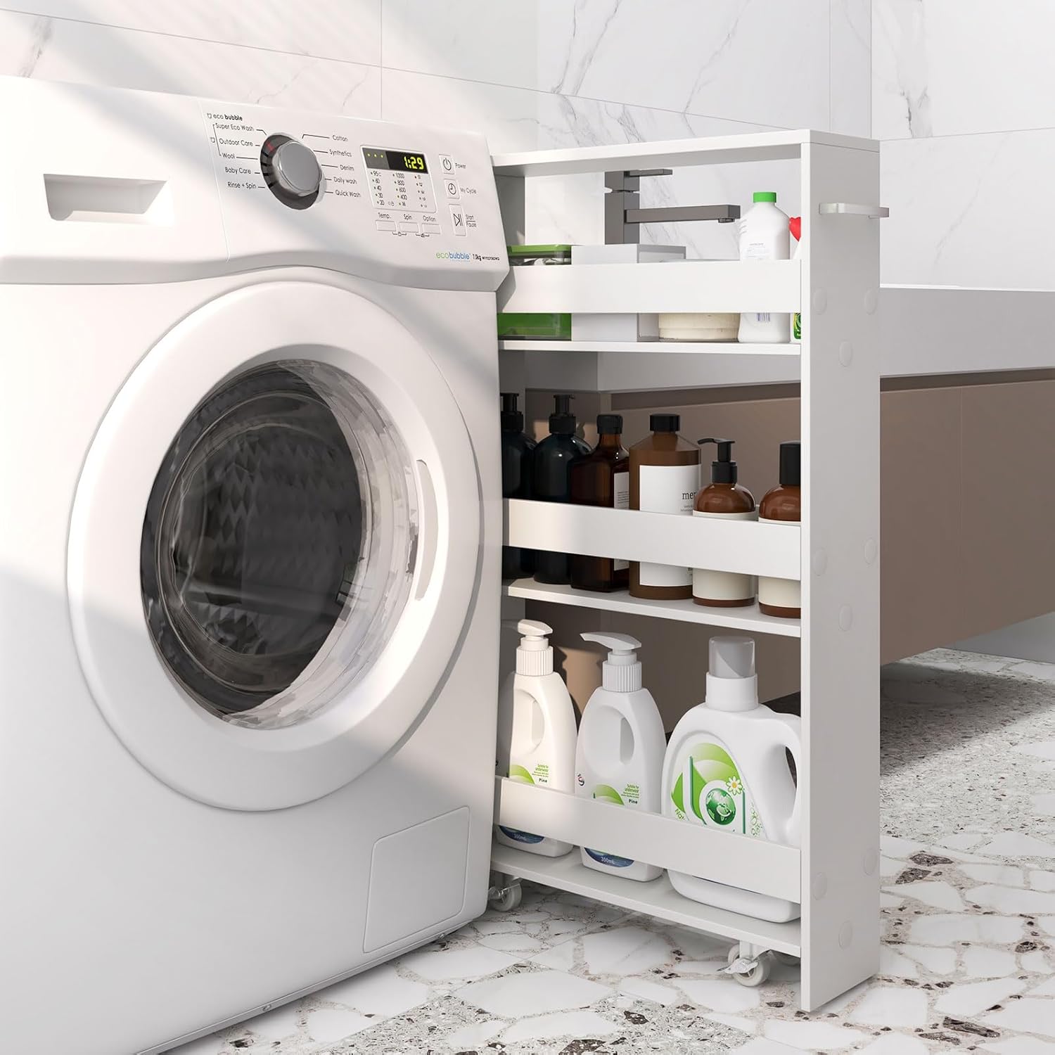 • Space-Smart Design: Measuring 19” x 5” x 32”, this slim storage cart tucks neatly into tight spaces like kitchen corners or bathroom nooks, transforming underutilized areas into functional storage zones. You can also put it by the couch, by the fridge.