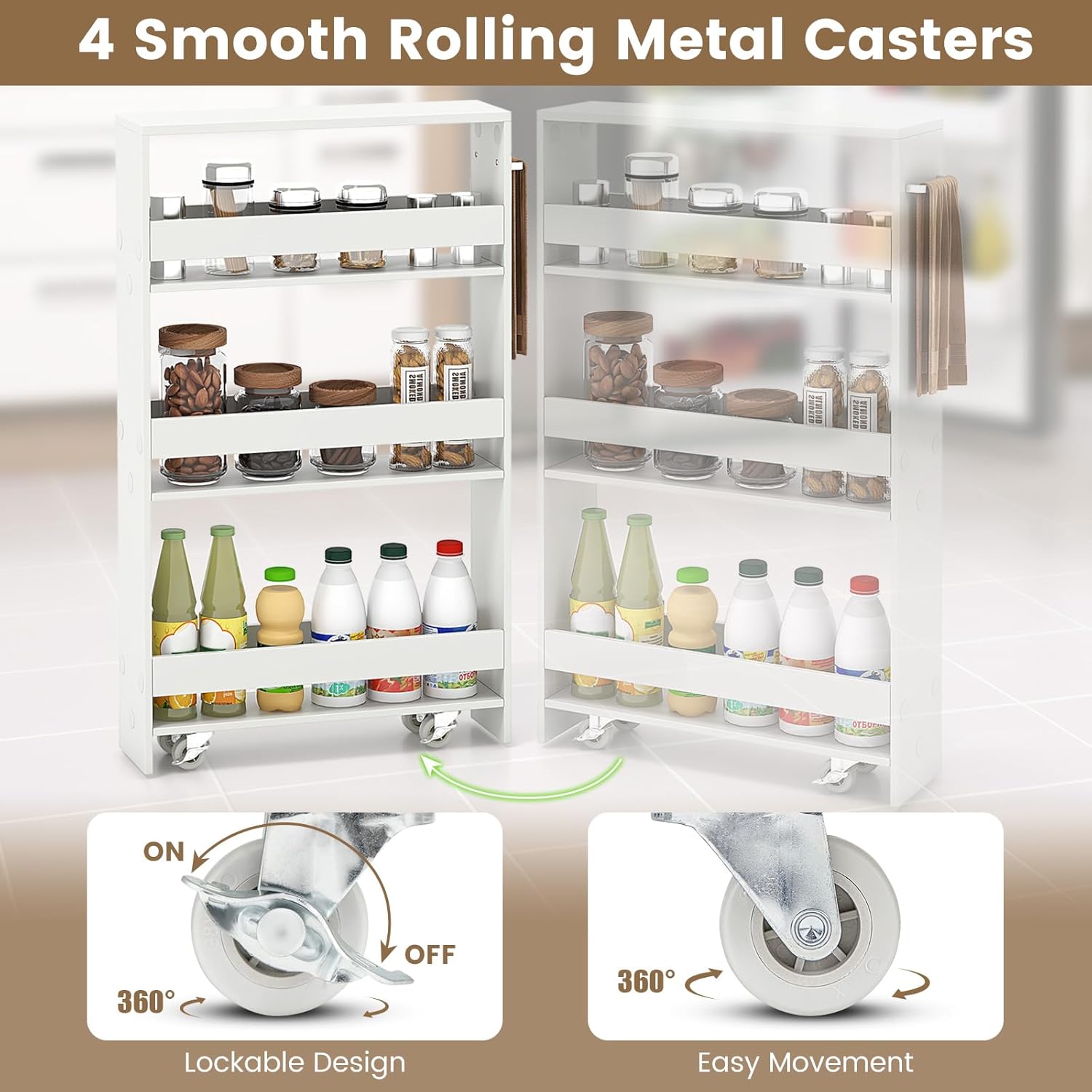 • Four-tier Storage Program: 4 tiers accommodate items of varying sizes, such as spices, beverages, cooking tools, or toiletries. Our narrow rolling shelf also includes integrated side barriers on each shelf to keep contents stable, reducing slips and protecting fragile jars like oils or condiments from accidental drops.