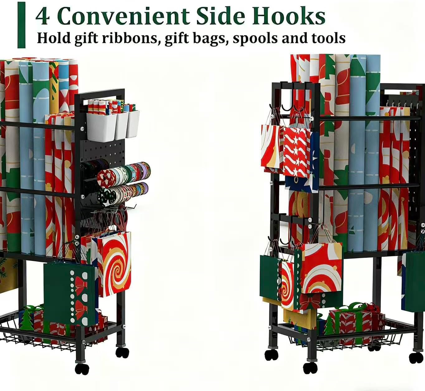 Rolling Wrapping Paper Organizer Cart with Pegboard & Storage Baskets, Gift Wrap Station with Hooks, Holders, Wheels & Containers for Ribbons, Bags, Craft Supplies – Heavy-Duty Metal Gift Wrapping Station