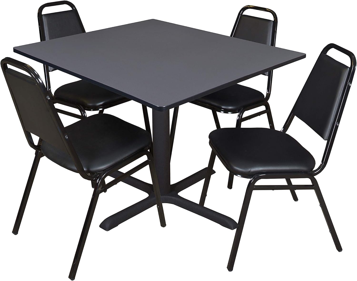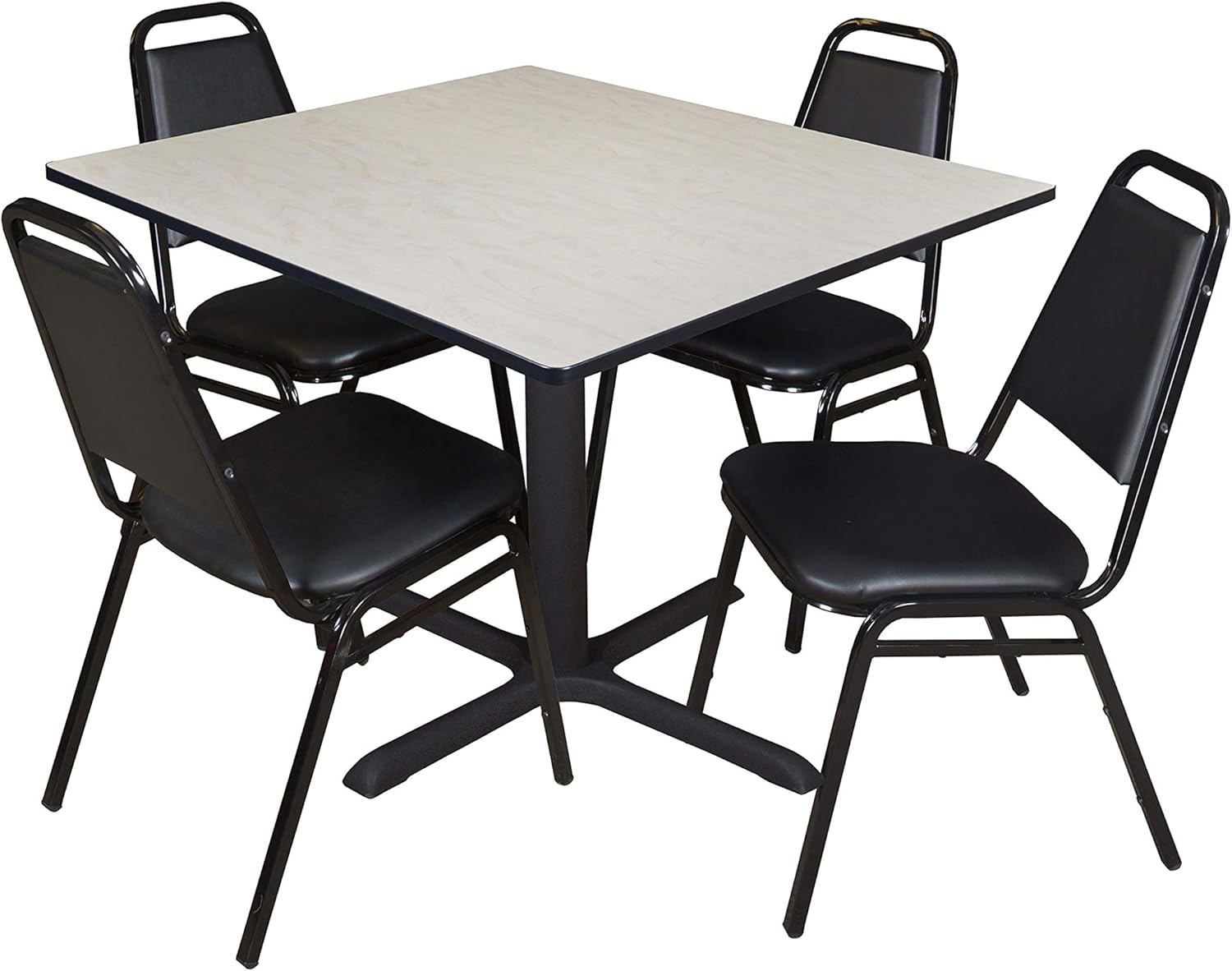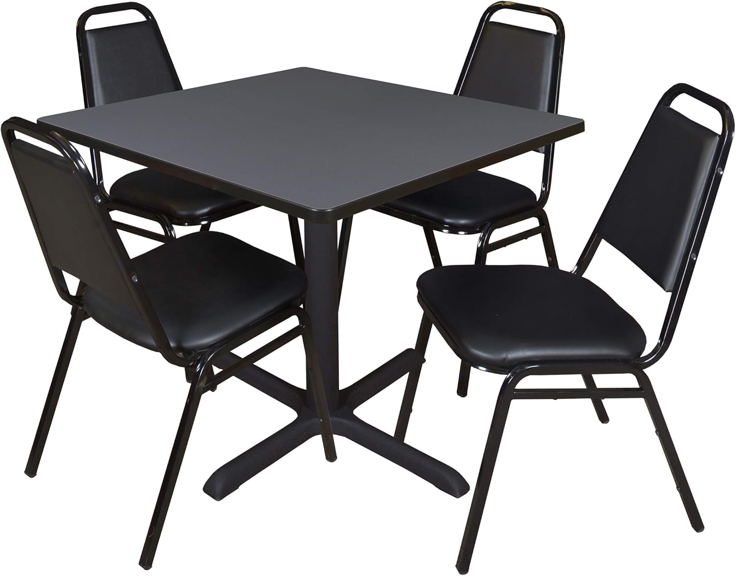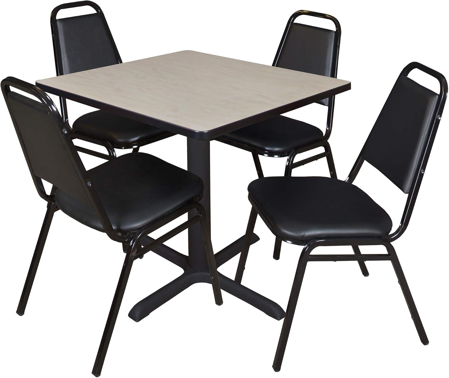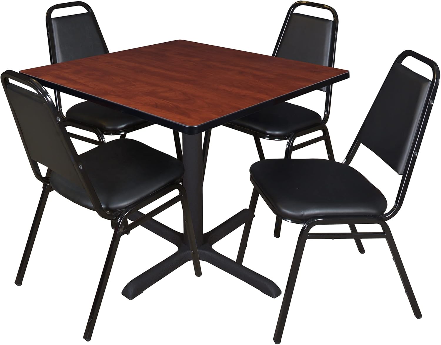 Whether you're planning a lounge, cafe, library, breakroom or restaurant, let the Pillar Collection take you there. These versatile tables are at home in stylish cafe or coffee shop settings as well as lunch rooms. This set includes one 30-inch square Pillar table and four Restaurant Stack Chairs. The table is constructed of a thermal fused melamine laminate tabletop that is 1-inch thick and finished with a black Bumper Edge edge band. This Mahogany tabletop is double-sided and finished in Mocha Walnut on the other side. Rounded corners make the table safer for everyone. Simply pick the side you like and install the base on the other. Self tapping wood screws and a placement template are included. Laminates are scratch, stain and scald resistant and wipe clean easily. The stylish X-Base is constructed of a tubular steel post and solid steel X-Base. Hidden adjustable glides Trekp the tabletop level and are easy to adjust. Inspired by the classic black cafe look, the Restaurant Stack Chair is designed for use in almost any setting. The water-repellent vinyl seat and back easily wipe clean with a damp cloth. Reinforced cross-bracing on the black metal frame make this versatile stack chair suitable for every day wear and tear. It can easily be stored away in stacks of 12. All Romig chairs are backed by a 5-year limited manufacturer's warranty on chair bases and frames and a 2-year limited manufacturer's warranty on chair mechanisms and upholstery. Pillar tables are backed by a 10-Year Limited Manufacturer's Warranty.