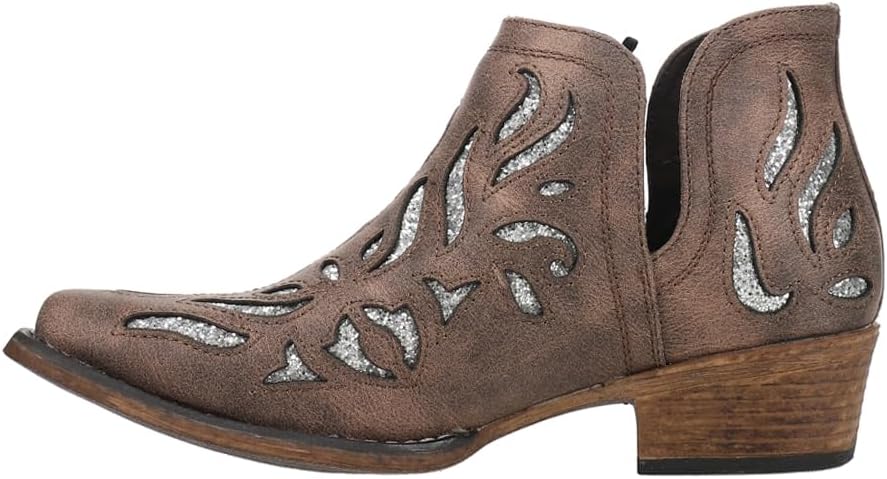A Modern Cowboy Bootie With Bold Western Flair, The Ava Features A Faux Leather Upper With Glitter Inlay, Single Stitch Welt, And Double Side Cutouts For Easy Slip-On Wear.