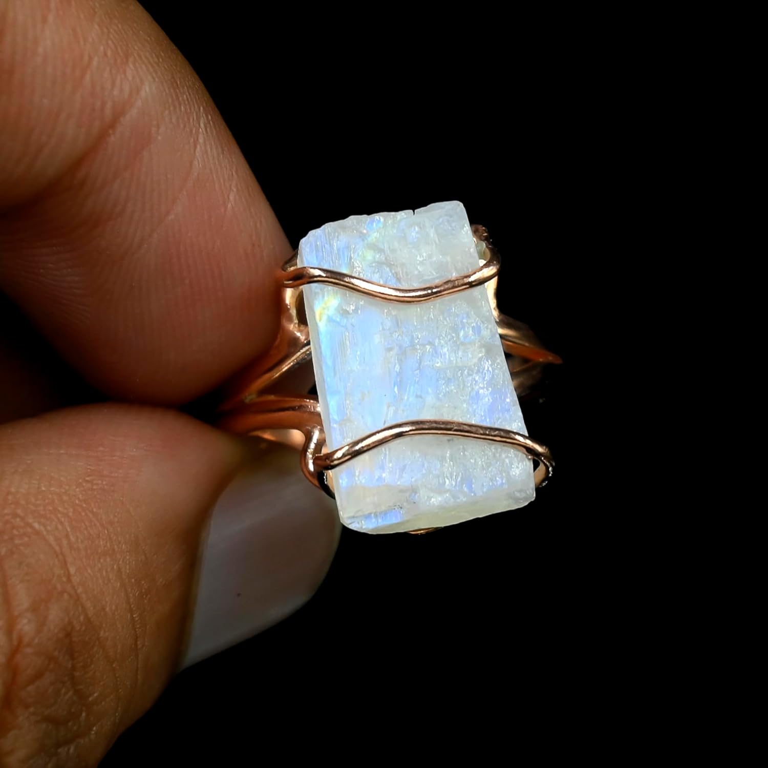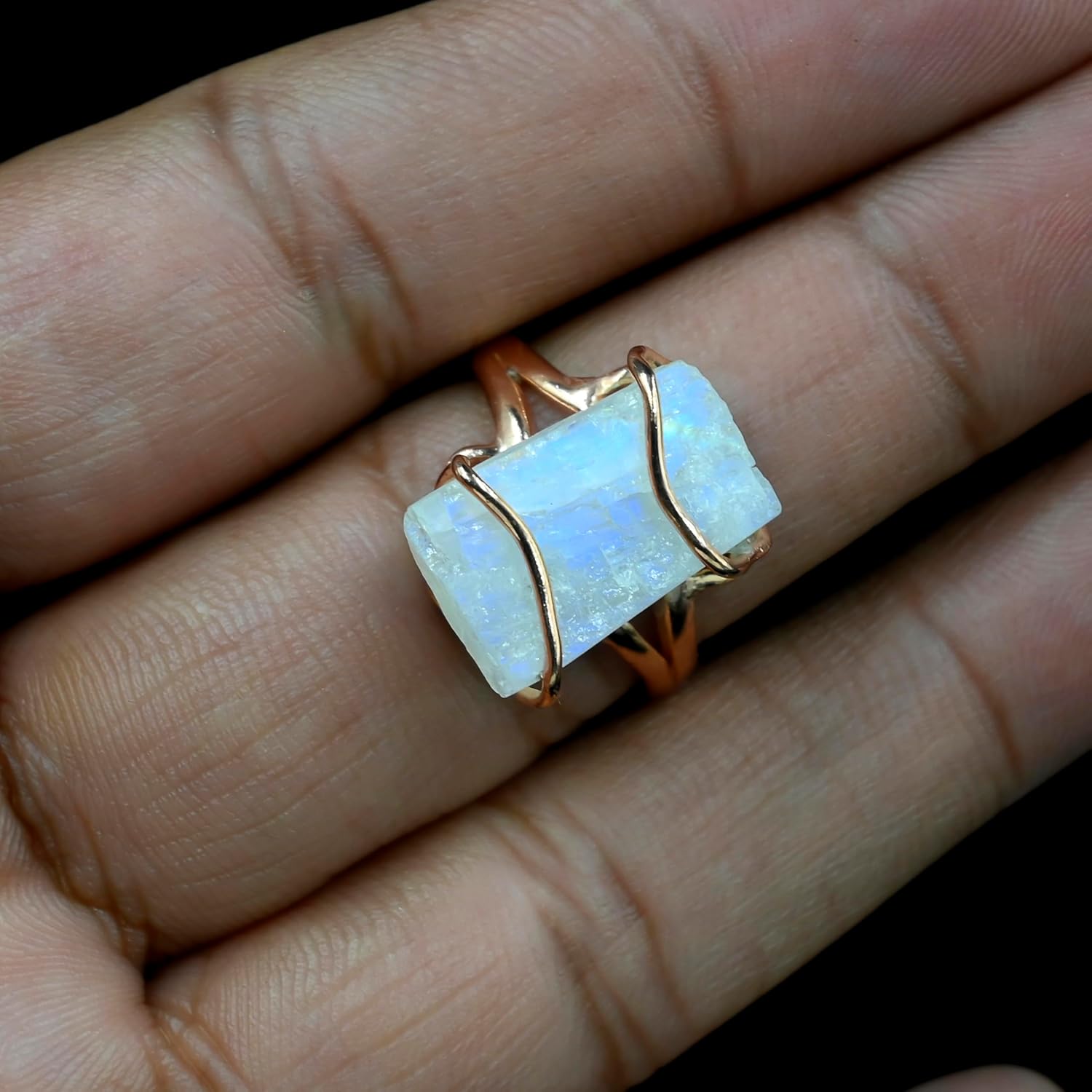 This rose gold ring showcases the beauty of a natural rainbow moonstone in its raw form. Perfect as a statement piece or a thoughtful Valentine’s Day gift, it combines elegance with spiritual meaning. 🌙 Natural Rainbow Moonstone: Features a stunning raw moonstone, believed to enhance intuition and emotional balance. 💍 Rose Gold Finish: Solid 925 sterling silver with a radiant rose gold plating for a modern, romantic touch. 🎁 Perfect Gift: Ideal for Valentine's, anniversaries, or just as a gesture of love. ✨ Handcrafted Design: Each ring is uniquely made, ensuring no two are alike. About Gemstone : Healing Properties and Benefits of Rainbow Moonstone: It's said to quiet the brain, relieve inner disturbances, and improve psychic abilities. Furthermore, rainbow moonstone is believed to promote fertility, balance hormones, and alleviate menstrual cramps—a genuine gift from Mother Earth for ladies everywhere! Thanks For Visit !