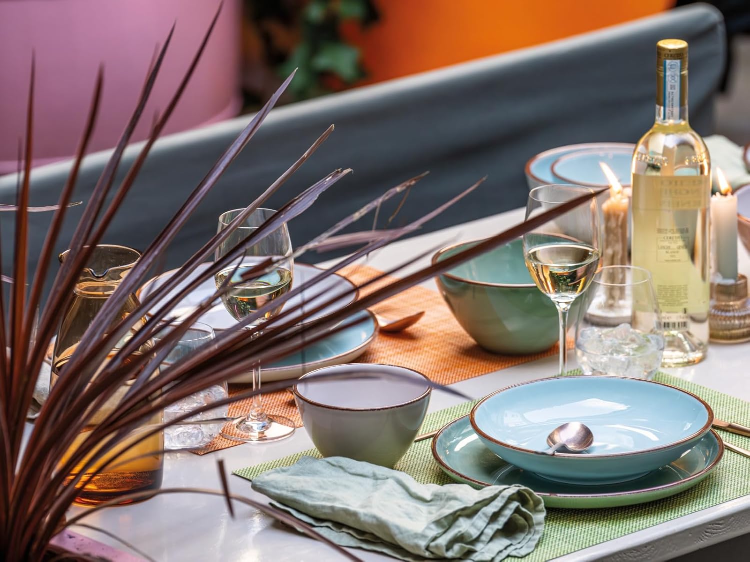 A design for relaxed hours and casual places. Plates and bowls are decorated in delicate pastel colours. Hand-painted striped border in chestnut colour gives the porcelain items a high-quality and artisanal effect. The series is the protagonis for sharing dishes and presents finger food casually elegant.