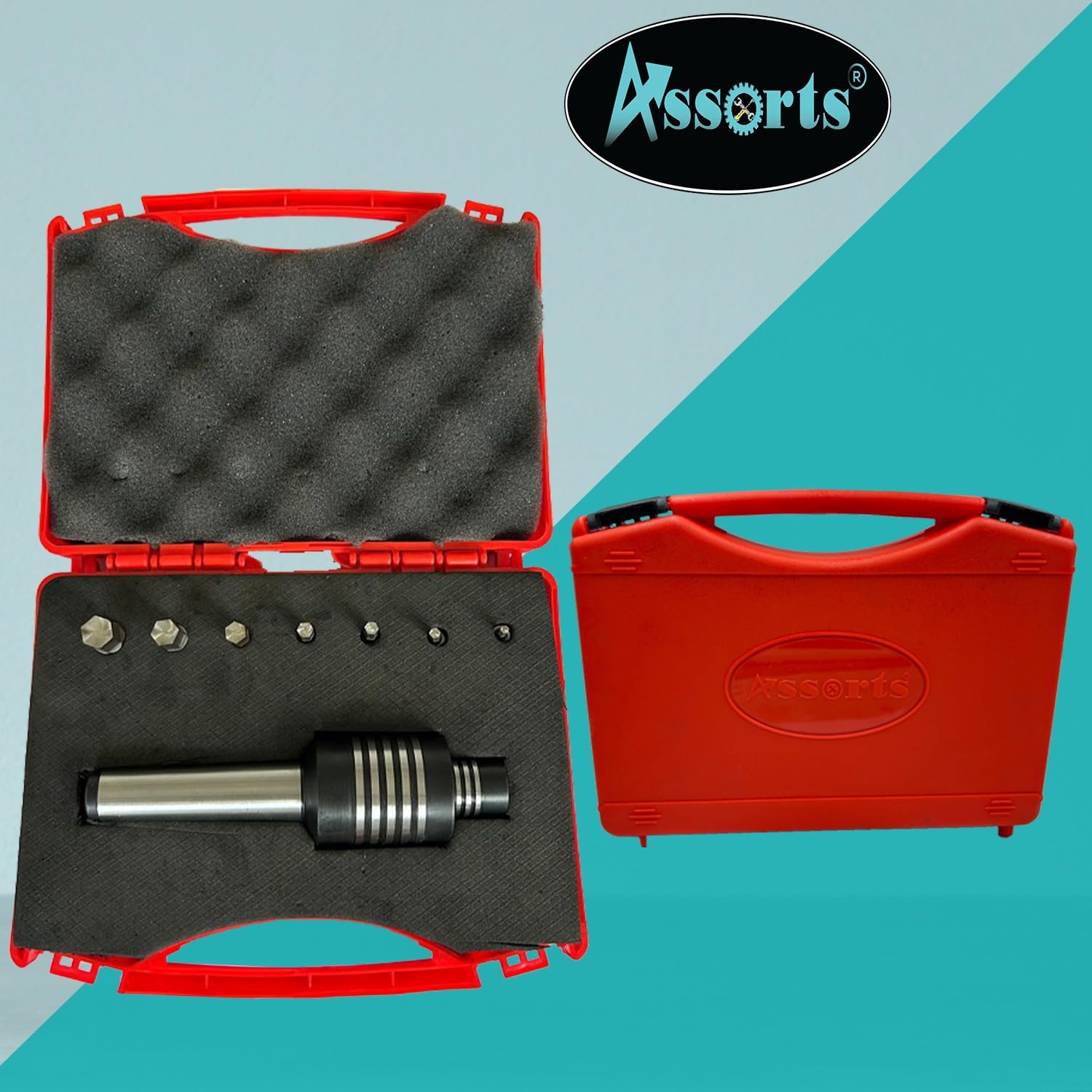 This rotary broaching tool set is engineered for precision and efficiency in internal hex machining applications. Equipped with an MT3 shank and a live center mechanism, it ensures stable operation and smooth rotation during the broaching process. The set includes a range of HSS hex broaches from 3mm to 12mm, allowing flexibility for different machining requirements. Manufactured from high-quality high-speed steel, the tools offer excellent durability, wear resistance, and consistent cutting performance. Ideal for use on lathe machines, this tool set simplifies the process of creating internal hex shapes in various metals. Its robust design and reliable performance make it suitable for professional workshops and industrial environments.