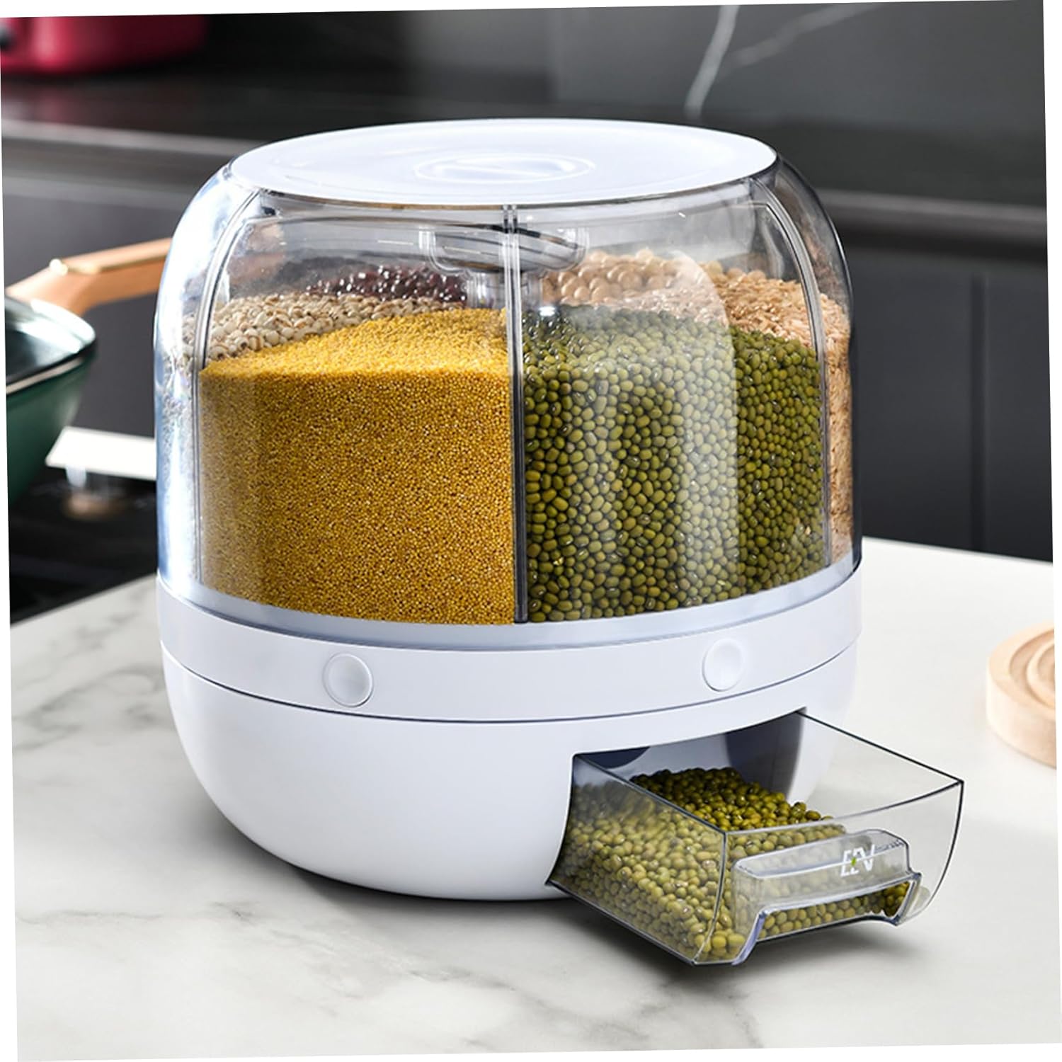 Description: Declutter your pantry and simplify meal prep with our Rotating 6-Grid Grain Dispenser. This versatile organizer consolidates up to six different dry goods-think rice, quinoa, lentils, or nuts-into one sleek, white unit that spins for easy access. The clear body lets you monitor supplies, while the design aims to keep food contained and tidy. Refilling is simple thanks to the removable top, and the integrated front drawer catches dispensed items. Perfect for a functional and modern kitchen, it helps turn chaotic cabinets into an efficient, organized system right on your countertop. Features:. -Color: White. -Material: Plastic. -Size: 24×24 cm / 9.4×9.4 inch. Note:Manual measurement, please allow slight errors on size.The colors may exist slight difference due to different screens. Package Including 1 * Rotating Candy Dispenser