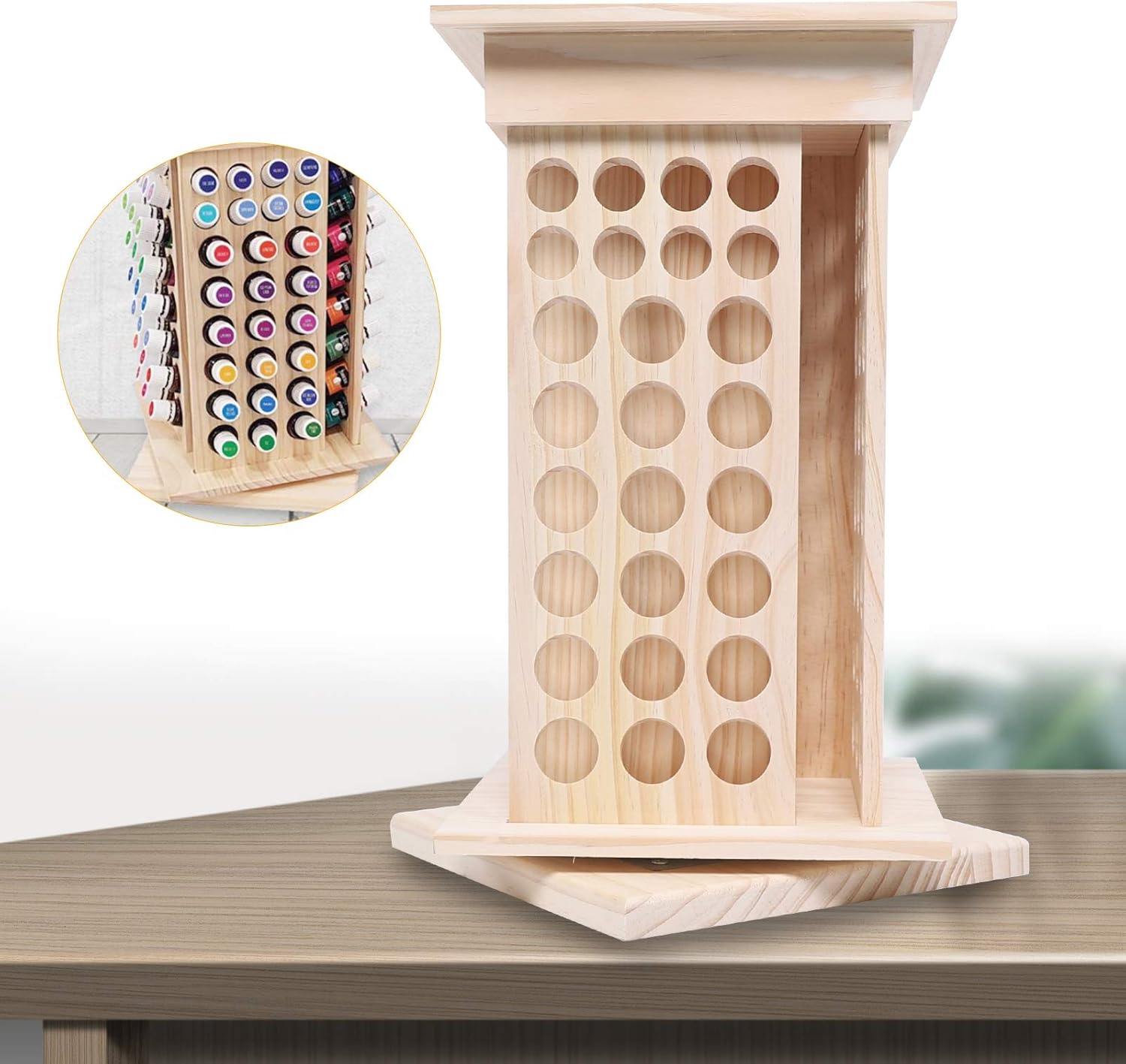 DescriptionThis essential oil display rack features a multi-tier categorized display that neatly organizes and easily holds a large number of essential oil bottles. Whether for store display or home storage, it enhances the texture of the space and is easy to access, making it ideal for essential oil management!Details Different Hole Diameters: It comes with two kinds of hole diameters to store essential oil bottles with different capacity capacities. (The top two rows of small holes are 1.02in diameter and can hold 0.17 Oz essential oil bottles. The other rows are 1.18-in-diameter holes, which can hold 0.51 Oz essential oil bottles).ApplicationIt can be used to hold creams, body lotions, lip balms, nail polish, lipstick, and other liquid bottles, and is widely used in beauty stores, bedrooms, living rooms, offices, beauty centers, stores, exhibitions, and other places.SpecificationBrand:WATEBATHMaterial: Pine Wood, IronProcess: PolishedColor: Wood ColorShape: RectangularStyle: ModernMount Type: DesktopAssembly Required: NoNumber of Tiers: 8Number of Holes: 104Rotation Angle: 360°Hole Diameter: 2.6cm/1.02in, 3cm/1.18inApplicable Essential Oil Bottle Capacity: 5ml/0.17 Oz, 15ml/0.51 OzProduct Size: 24*24*40cm/9.44*9.44*15.74inPackage Size: 28*28*48cm/11.02*11.02*18.9inGross Weight: 4.18kg/9.22lbsNet Weight: 3.97kg/8.75lbsPackage Included1* Essential Oil Display RackNotes 1. Please check the style and size before purchasing.2. Please note that this item is a display rack only and does not include essential oil bottles.3. Please allow the slight color difference caused by the shooting light and 1-3cm error due to manual measurement and make sure you do not mind before ordering.