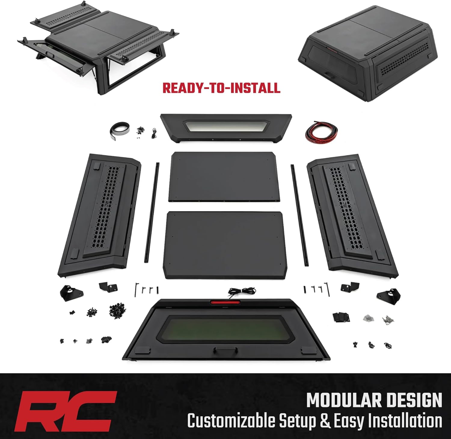 | Included Components | (1) Interior LED Light Strip & (1) Integrated Brake Light, (1) Modular Truck Bed Cap, (2) Exterior Molle Panels & Bed Utility Rail, (2) Side Panels & (1) Rear Door Window, Key Locks & Hardware |