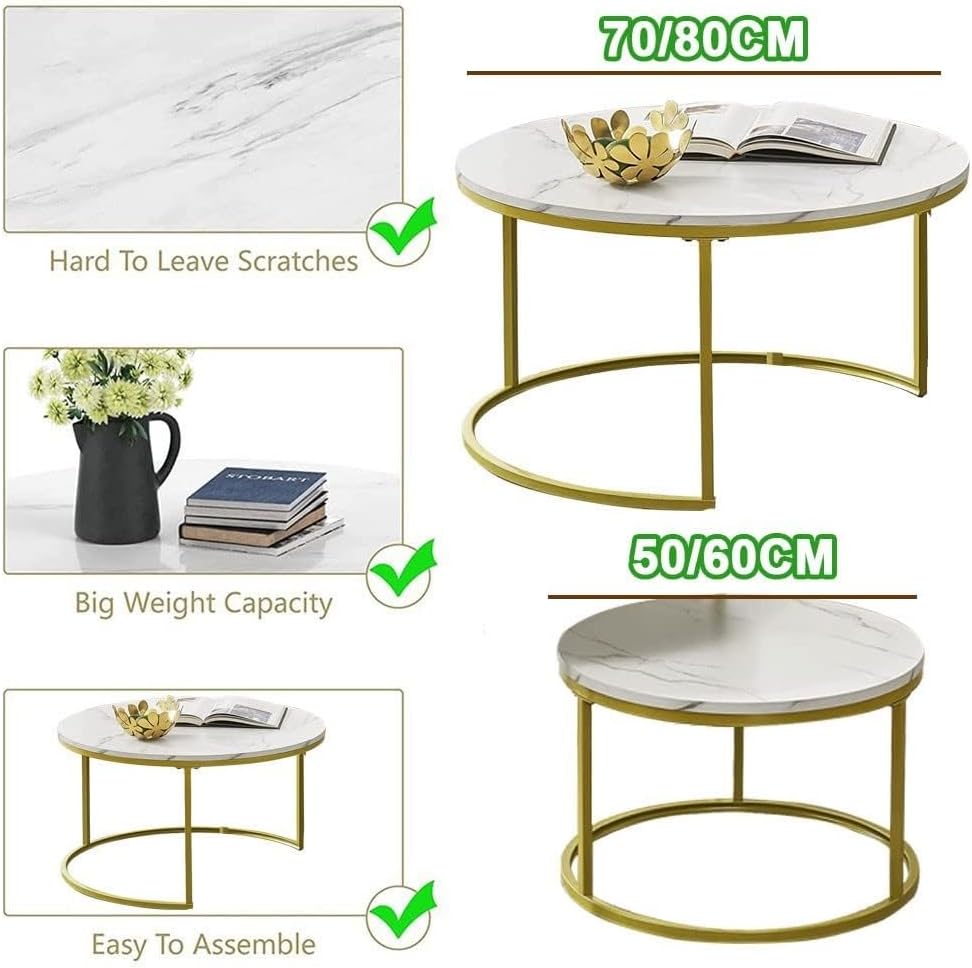 Transform your living space with our set of 2 Nesting Table Stacking with Space Saving Design! Featuring a large and a small freestanding table that can be stacked, these coffee end tables are perfect for small spaces while adding a touch of modern elegance to your home decor. Made with high-quality, glass, and steel frame, this living room coffee table is both sturdy and durable.Practical and versatile, this simple sofa table is perfect for any room decoration, from your home living room to your office waiting room. Its classic-looking round shape and reasonable size make it an indispensable piece of furniture for every space, including extra rooms, conversational tables for spare rooms, and even in your kid's room.Not only does our nesting coffee table set offer you ample space, but it also offers you peace of mind with a packaging structure that includes five-layer corrugated cardboard to protect your purchase during shipment.Don't wait any longer and bring home our Set of 2 Nesting Table Stacking with Space Saving Design today. The package includes one large and one small side table so you can start enjoying your coffee and conversations in style. Order now and elevate your living space with our stylish and practical coffee end table set!