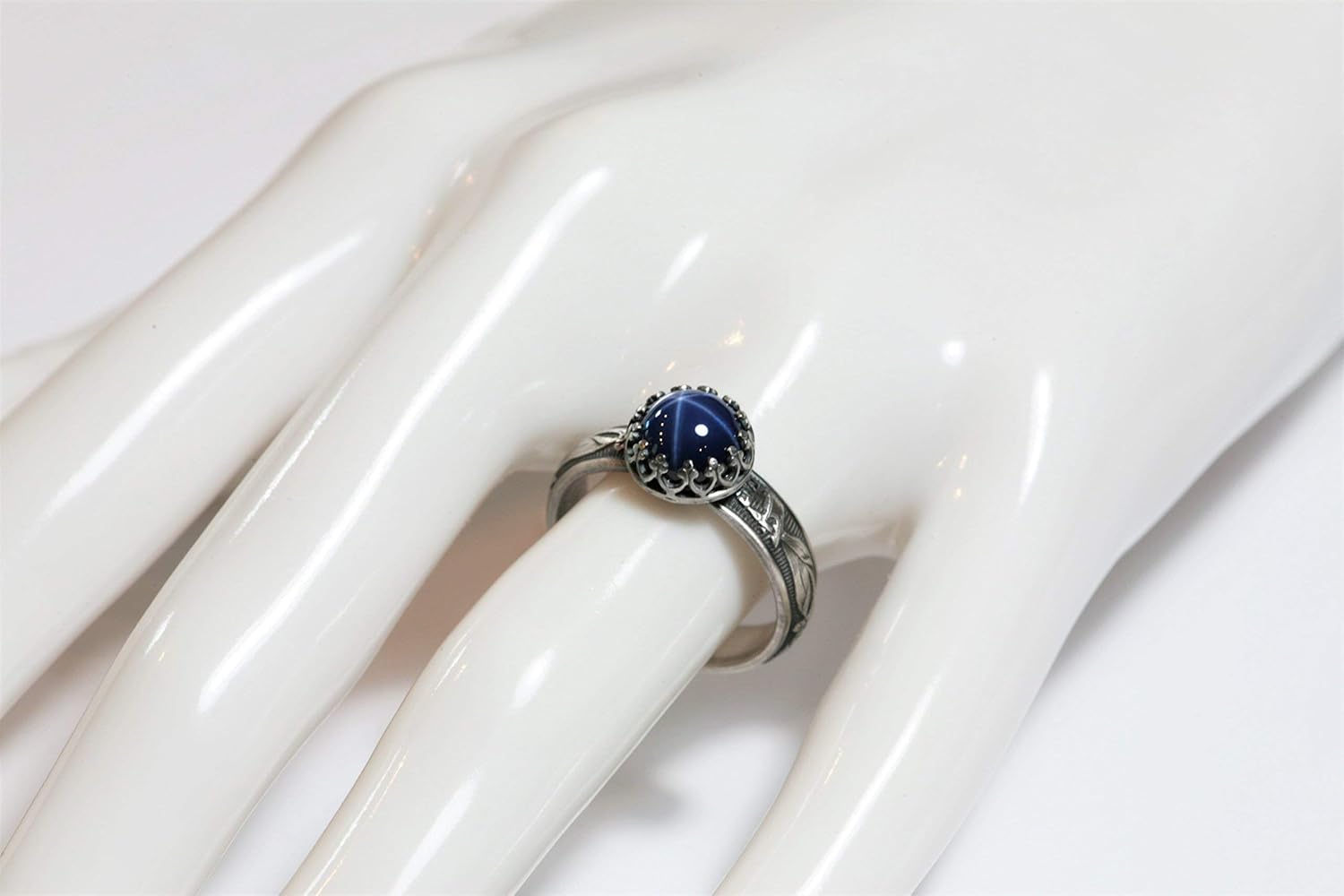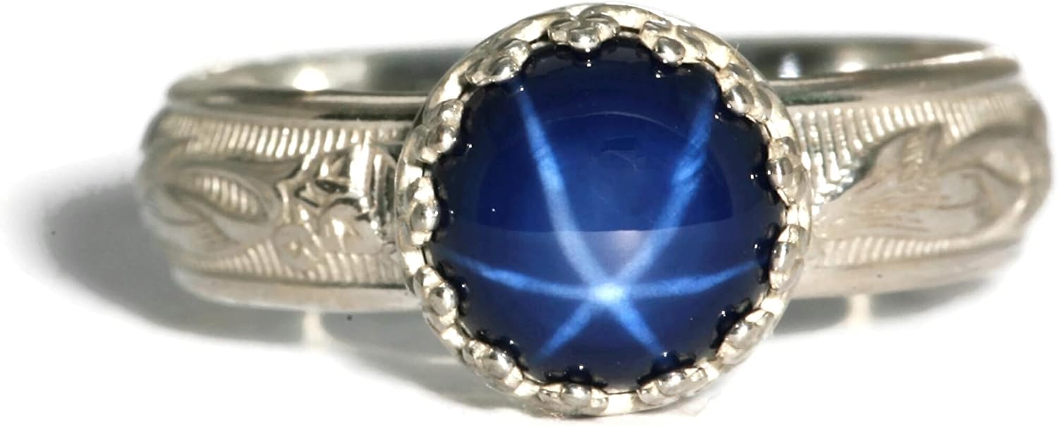 Lab Created Blue Star Sapphire RingFascinating Brilliance! This stone is reminiscent of the vintage “Lindy” synthetic Star Sapphire of the 50s thru 70s. The star effect, known as an “asterism”, is more defined in a lab-grown Sapphire. They are identical in chemical composition, brilliance, and physical appearance as their natural counterpart, however they have fewer flaws, are not mined from the ground, and are much less expensive. They are an extremely durable stone with a Mohs scale hardness or 9 (a Diamond is 10).This ring features a Crown bezel mounted lab created Star Sapphire on a 4.8mm wide 925 Sterling Silver Blooming Flower pattern band. Vintage or Polished Silver finish. Polishing cloth included for Polished finish. Ring sizer included. Shipped in gift box.Please note that the star effect or "asterism" of a Star Sapphire, is not a fixed element. It is the result of direct light, artificial or natural. The brighter the light source, the brighter the star display. In low light or shaded settings the star will be less visible. All photos are taken with direct light.Visit the Salish Sea Inspirations Store from the link at top to learn more and view all my offerings.