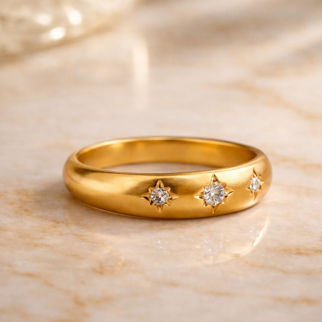 This elegant starburst wedding band is a beautiful blend of minimalist luxury and celestial inspiration. Crafted in radiant 14K yellow gold, the ring features a smooth, wide band accented with three round white stones, each set in a delicate starburst design that symbolizes light, guidance, and love. The polished gold surface and comfortable fit make this ring perfect for everyday wear or special occasions. Its bold yet understated design allows it to be worn alone as a statement ring or paired effortlessly with other bands. Whether chosen as a wedding band, anniversary ring, or promise ring, this celestial gold band is a timeless piece designed to be cherished for years to come.