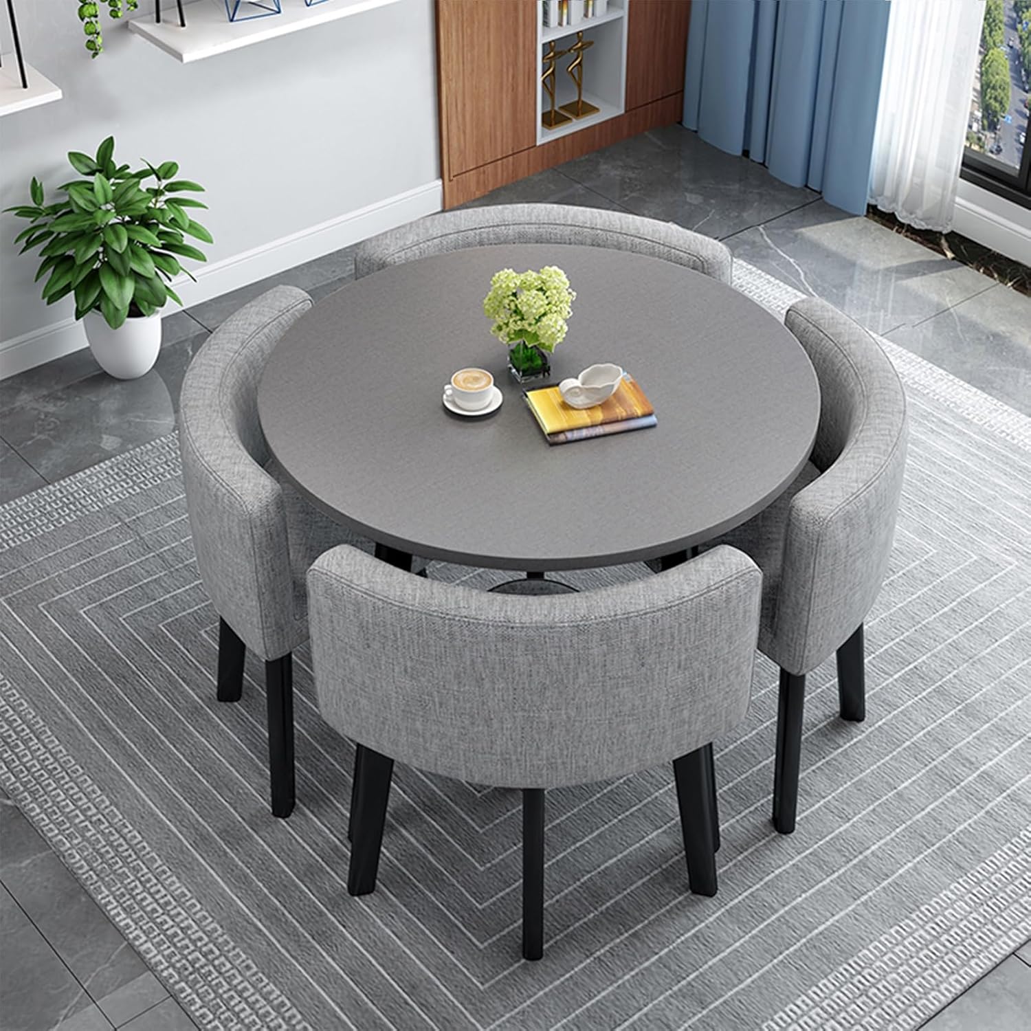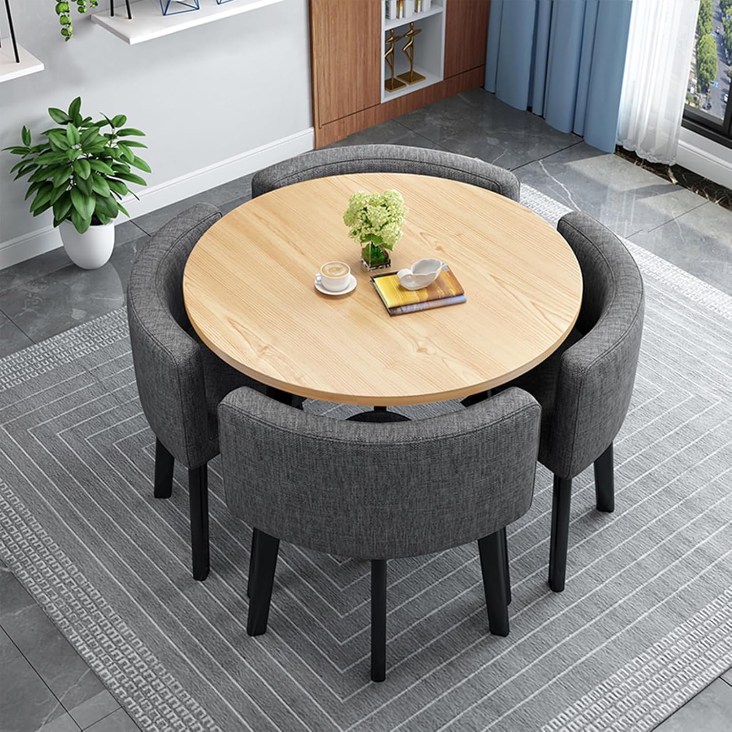 The combination of modern design and clean lines allow this small conference table to blend in with any decor. It can bring a touch of elegance and glamour to your space.Comfortable sponge seat bag/backrest, moderate hardness, good resilience, durable, refuses to collapse, making every sitting and standing more comfortable.Features: simple and elegant, saving spaceStyle: simple and modernBracket structure material: metalMesa shape: roundDesktop material: wood-based panelSeat cushion material: Comfortable and breathable cotton and linenTable top diameter: 31.4in/80cmTotal chair height: 28.7in/73cmApplicable scenarios: coffee shop, living room, kitchen, terrace, restaurant, lounge, reception room, office, outdoor, milk tea shop, bakery, hotel, negotiation room, bar, etc.✲Applicable number of people: 4 people✲Packing method: Assembled✲Packing list: 1*table, 4*chairsAfter receiving the goods, if you are satisfied with our products, please leave your real evaluation, thank you very much! Note:1. The product size is similar, there is a 1-2cm error, the actual size shall prevail.2. Due to the influence of light, angle, monitor and other factors in the picture, there may be color difference in the actual shooting of the product, please understand.