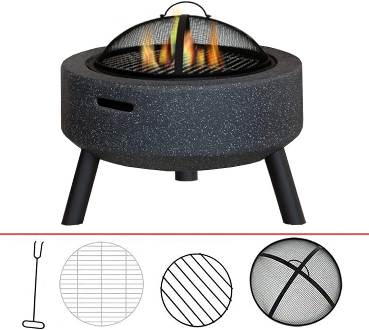 Features: Application: Enough size, allowing you to easily carry out outdoor barbecue activities, so that you do not have to worry about lack of space. The overall weight is relatively light, allowing you to move easily. Complete functions: The brazier can be used for barbecue parties, picnics, ice pits and other social activities. Safety protection: equipped with a spark screen to prevent sparks from splashing and protect your safety. The poker tool allows you to easily rearrange burning materials such as charcoal. Specification: Name: Outdoor charcoal grill. Color: gray/black Size: 59 x 36 cm/23.2 x 14.1 inches (diameter x height). Packing size: 69 x 69 x 33 cm (length*width*height) Weight: about 13 kg. Package weight: about 18 kg. If you have such a carbon brazier, it will definitely create a good atmosphere for your party and let your guests enjoy a good night.