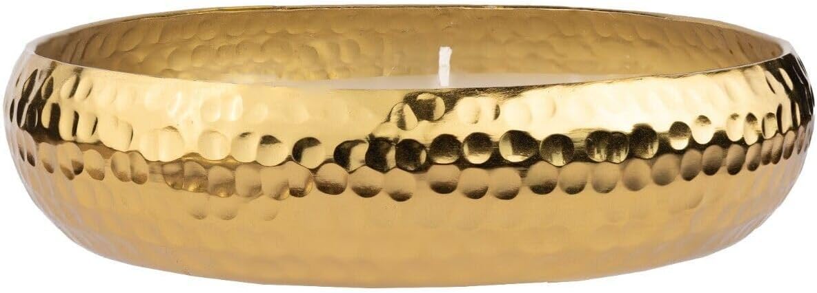 Round Gold Metal Display Bowl with Candle | 3 Wick Vanilla Scented Candle & Holder | Vanilla Fragrance - 16cmAdd glamour to your space with this 3-wick vanilla scented candle. Its serene fragrance and long-lasting burn make it a perfect gift or decor piece, creating a beautiful shine with its subtle hammered finishDISPLAY BOWL | Add a touch of sophistication with this gold bowl candle, perfect for bringing a refined and luxurious feel to any room in your homeSCENTED CANDLE | Fill your space with the soft, sweet aroma of vanilla, creating a calm and inviting atmosphere ideal for unwinding after a long day or setting the mood for relaxation3 WICK CANDLE | Designed with three wicks for an even, slow burn, this candle offers hours of aroma, making it the perfect addition for a warm, cosy evening at homeCANDLE GIFT | This scented candle makes a thoughtful and luxurious gift for any occasion, from birthdays to anniversaries or Mother's DayDECORATIVE CANDLE | The 16cm diameter candle bowl is crafted from durable aluminium with a hammered finish, catching the light beautifully for a stunning effect