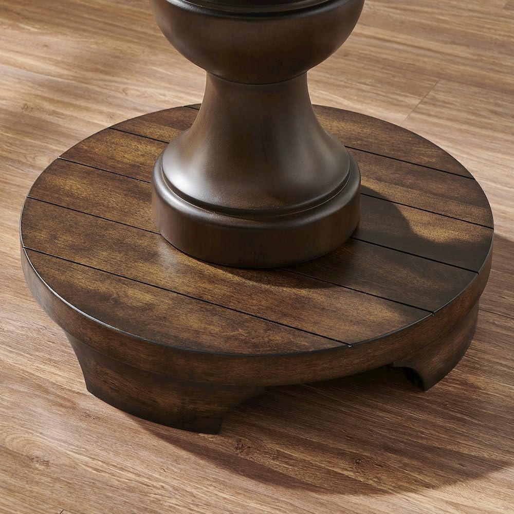 The Roundhill Furniture Caesar Traditional Round End Table elegantly blends rustic charm with modern sophistication. Inspired by craftsman-era simplicity and sculptural artistry, its refined design radiates warmth while anchoring living spaces with timeless appeal. Crafted from fine MDF, it balances durable sturdiness and sleek lines, supported by a stabilizing pedestal base. The 26-inch diameter surface accommodates books, decor, or essentials, merging practicality with style.